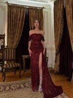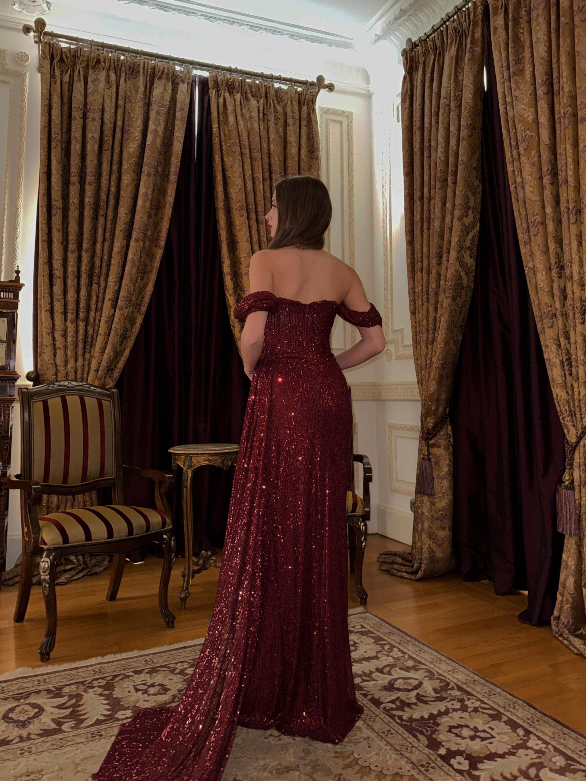 Allura Payetli Bordo Yırtmaç Detay Abiye
