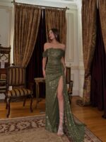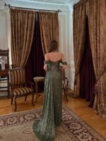 Ana Sayfa Elbise Allura Payetli Haki Yırtmaç Detay Abiye