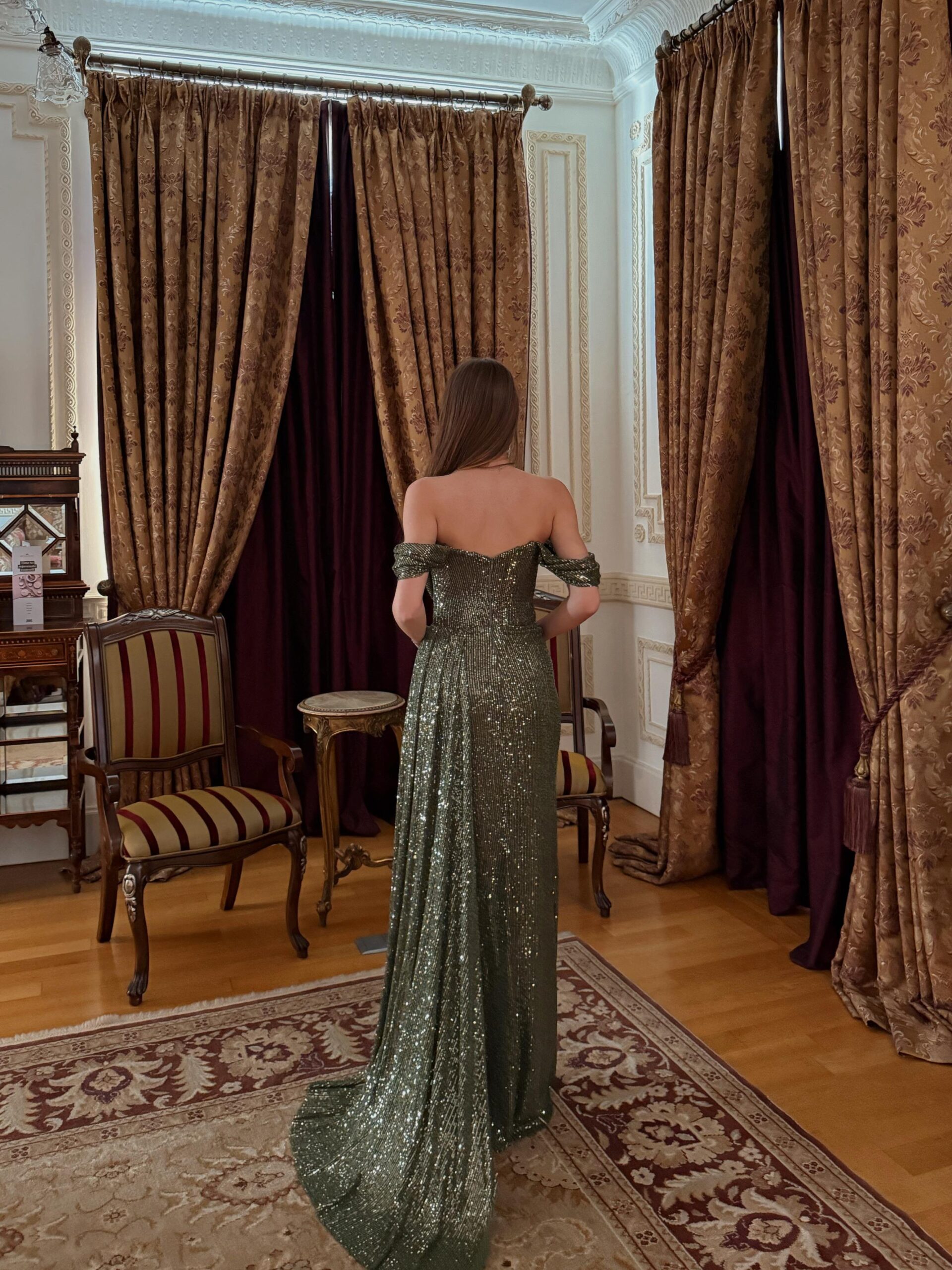 Allura Payetli Haki Yırtmaç Detay Abiye