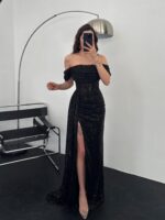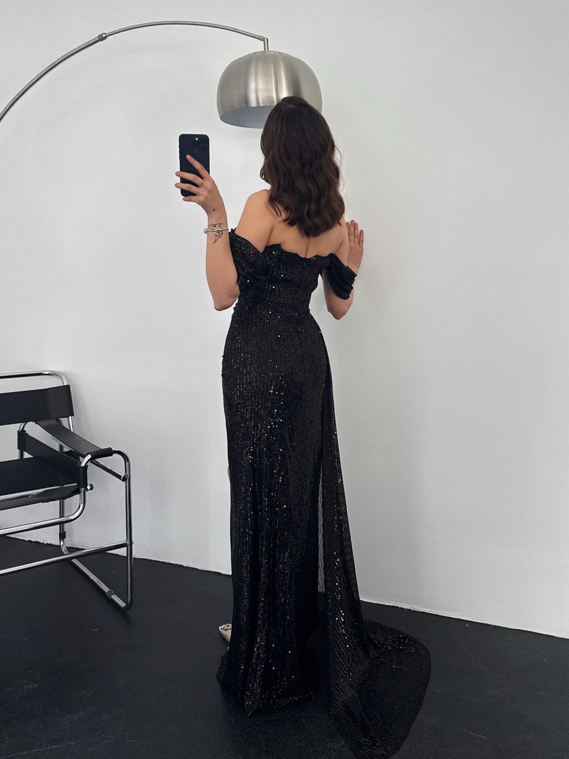Allura Payetli Siyah Yırtmaç Detay Abiye