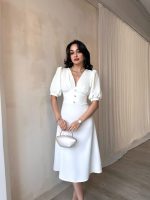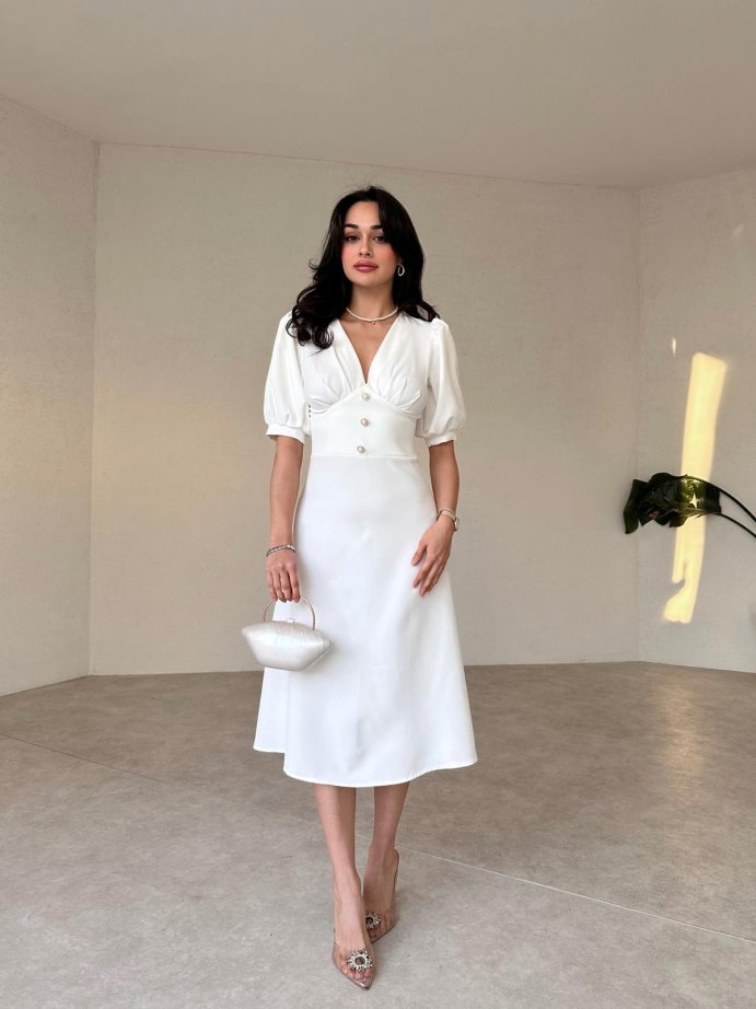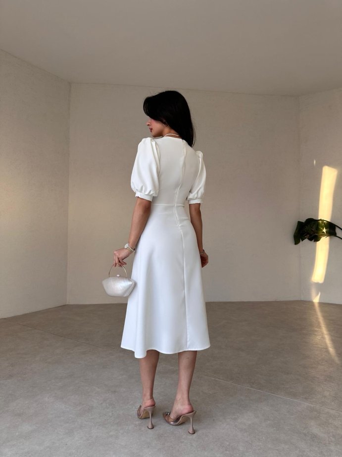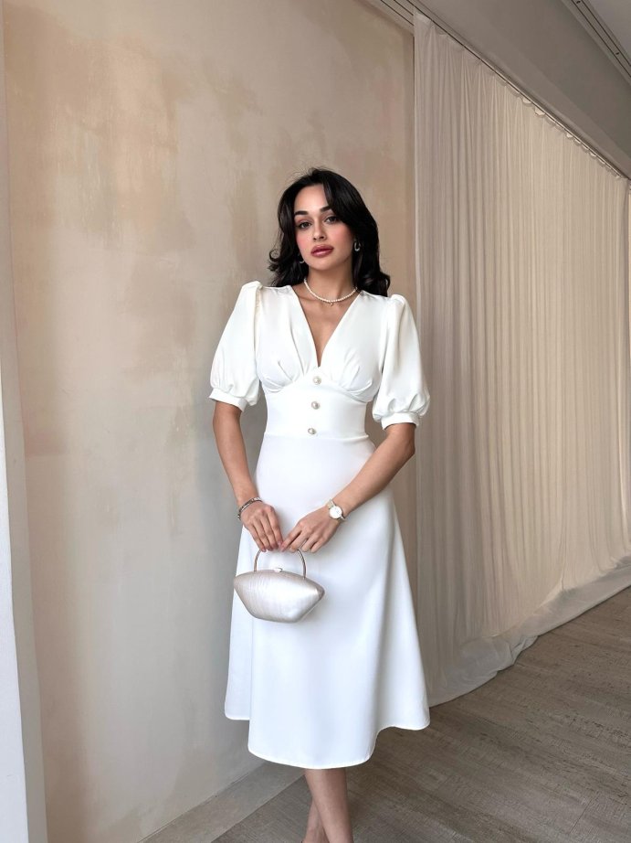Beyaz İnci Düğme Detaylı Yarım Kol Midi GABRİEL Elbise