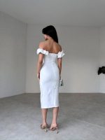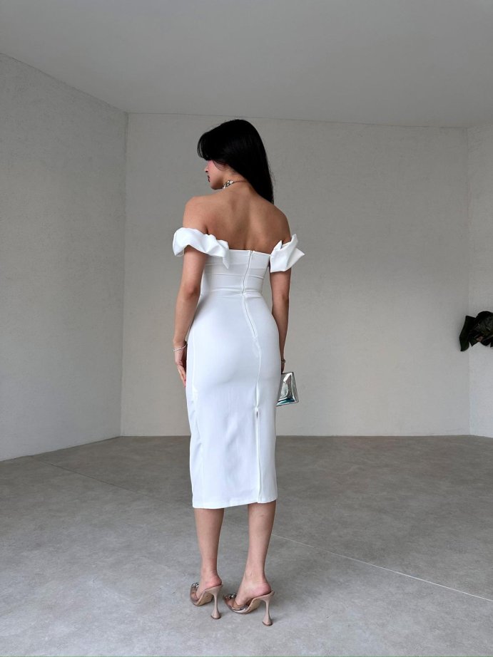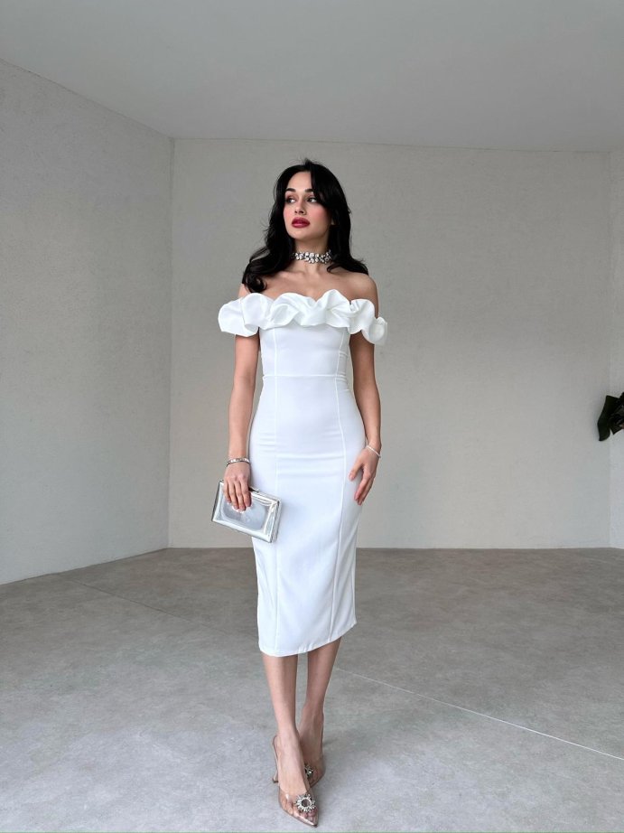 Fırfırlı Straplez Kalem Kesim Midi SOPHİA Elbise tam kalıplıdır.