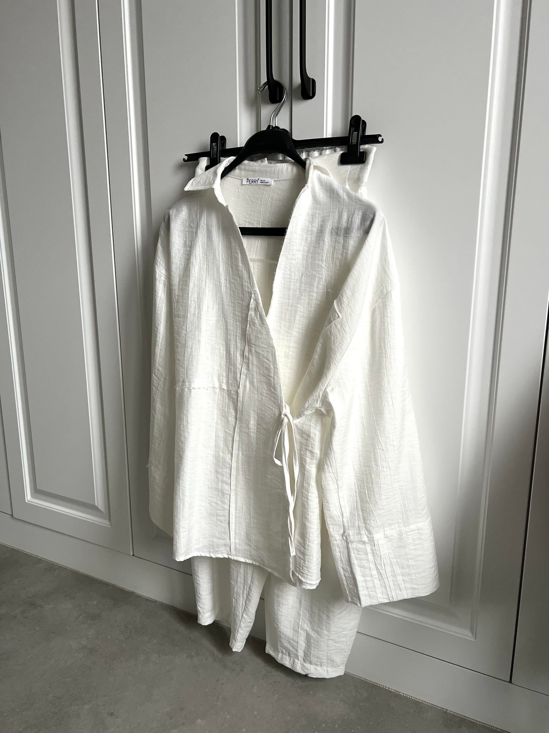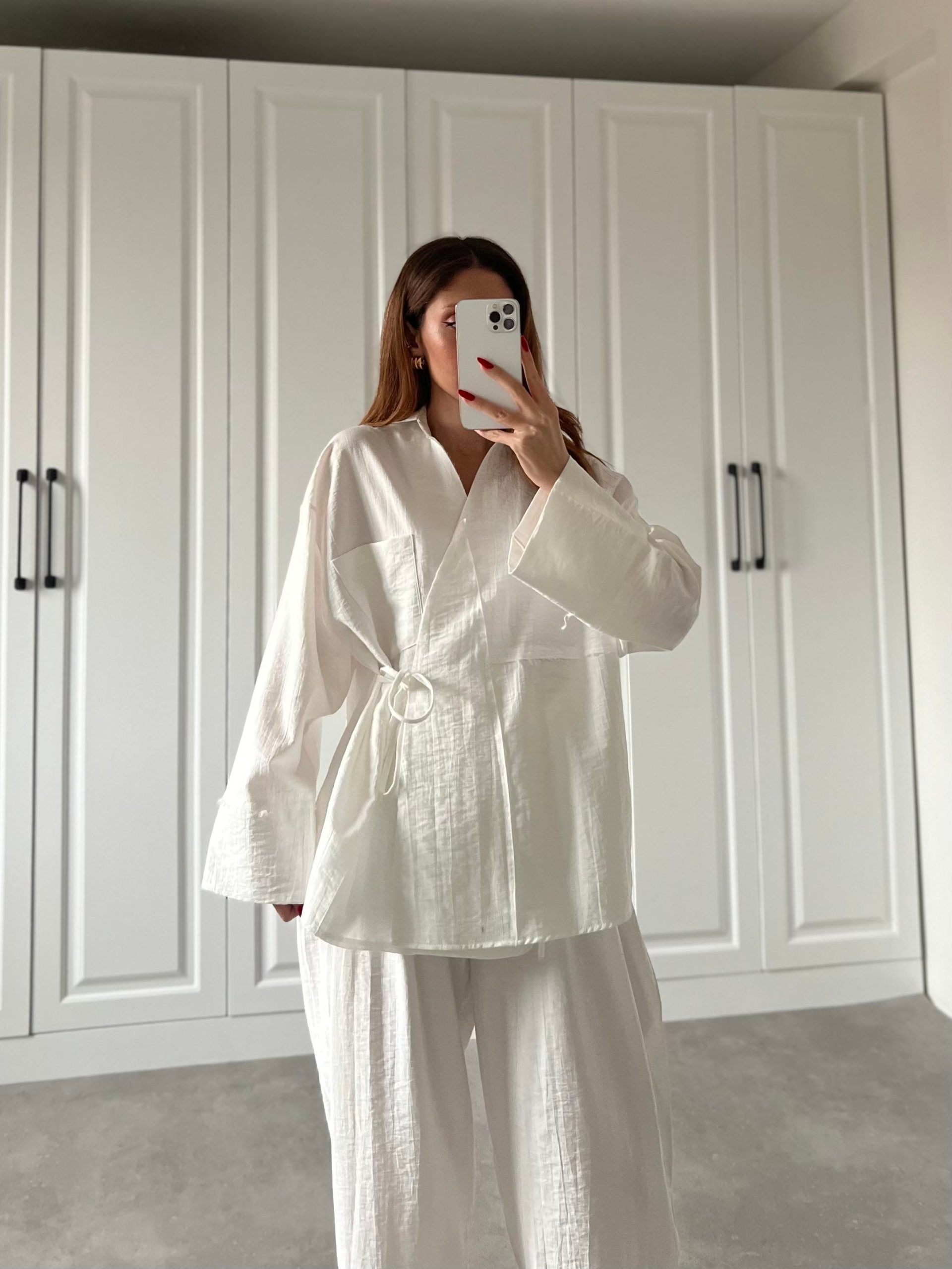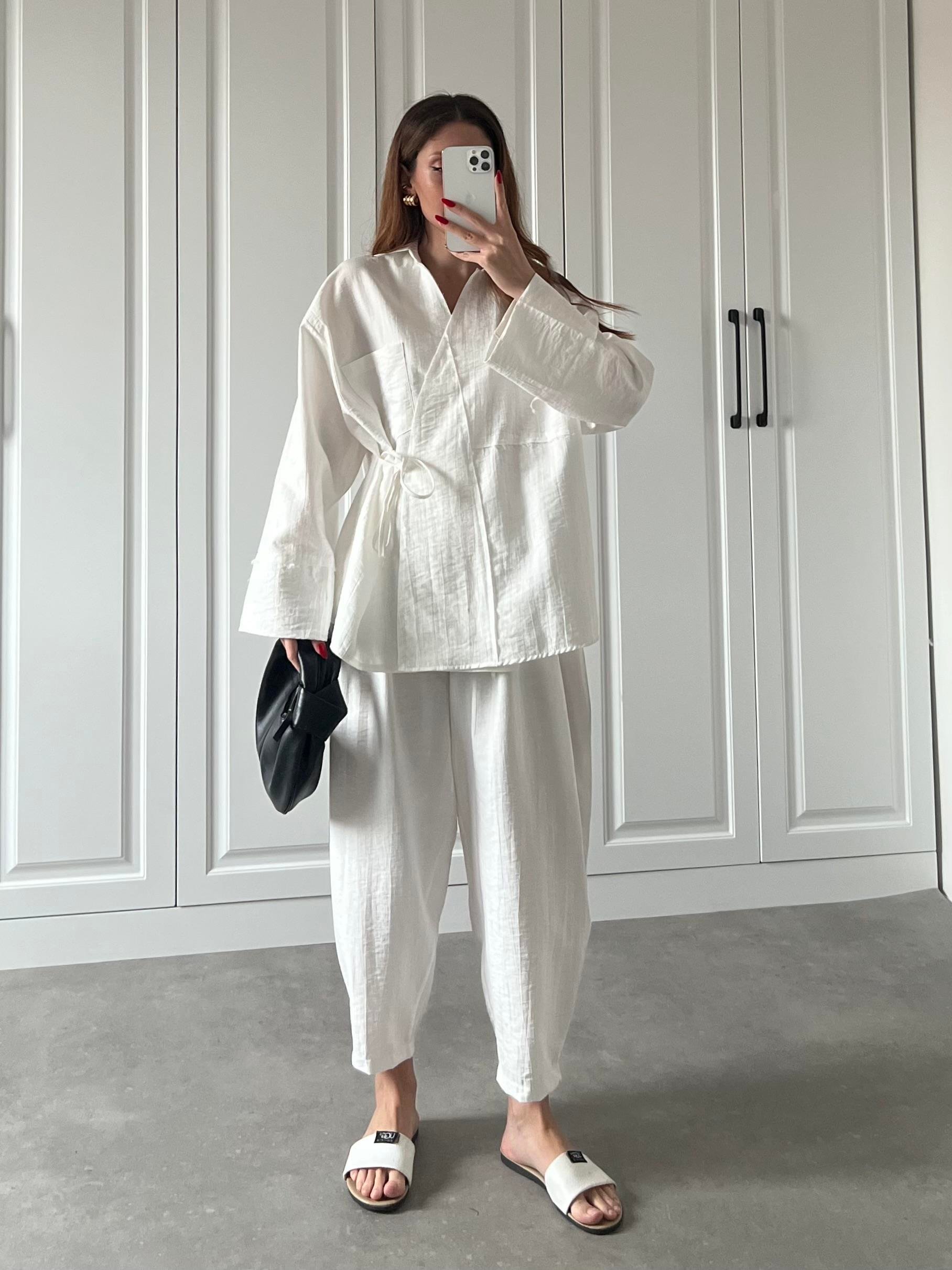 Beyaz Yandan Bağlamalı Coton Kimono Takım