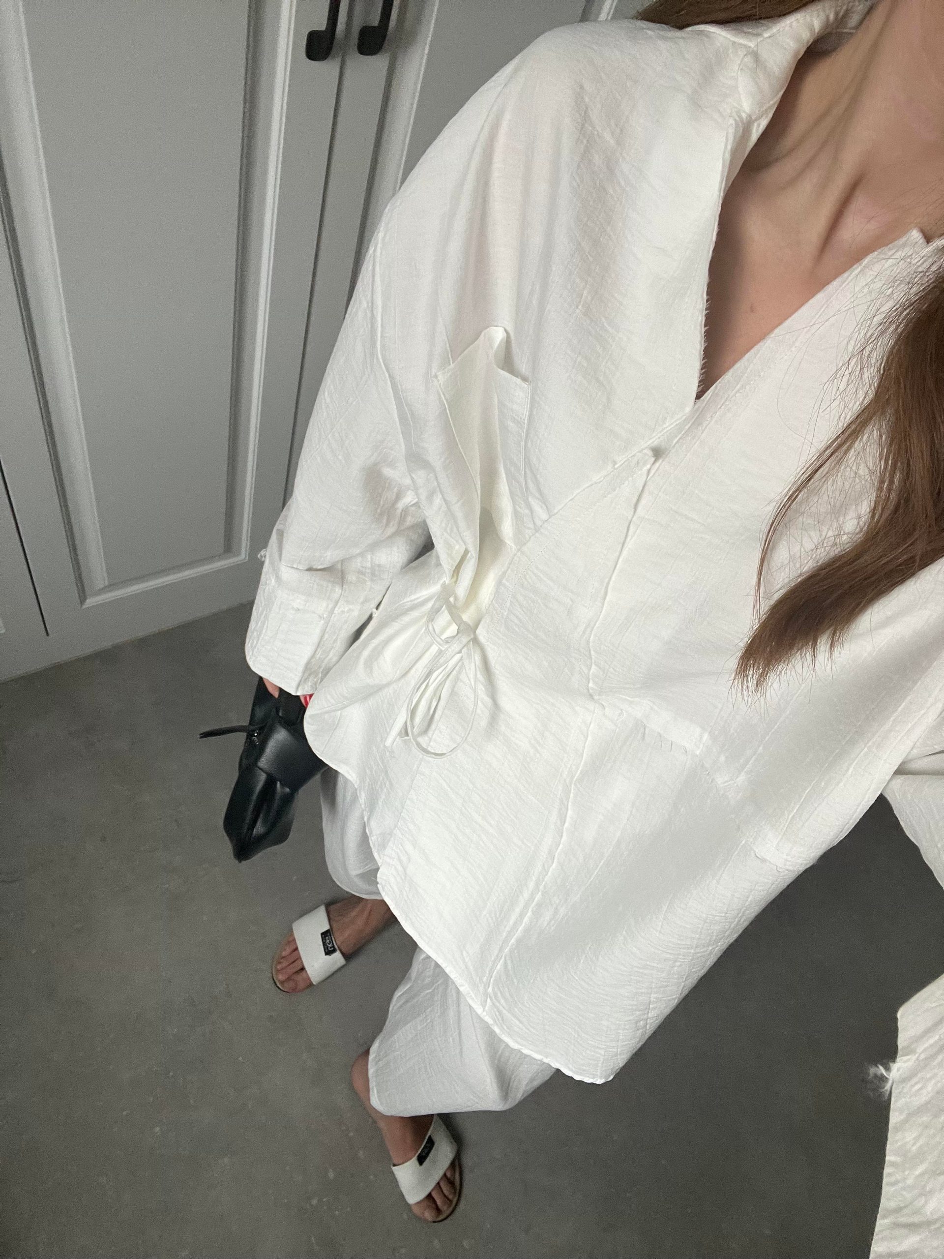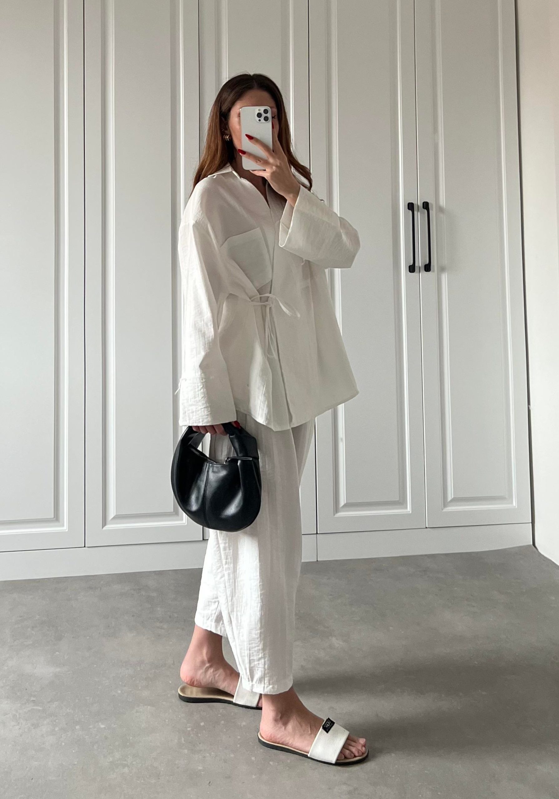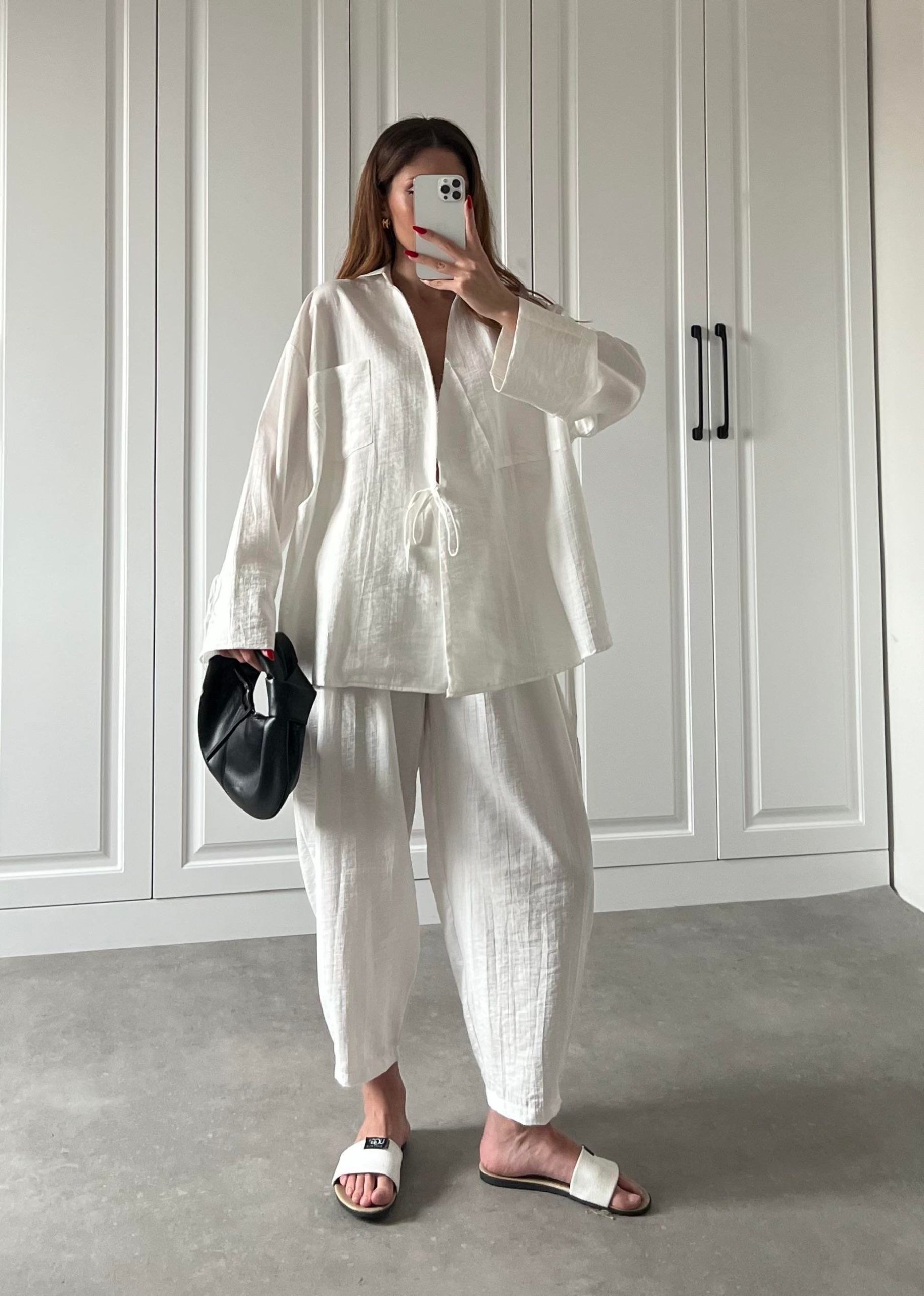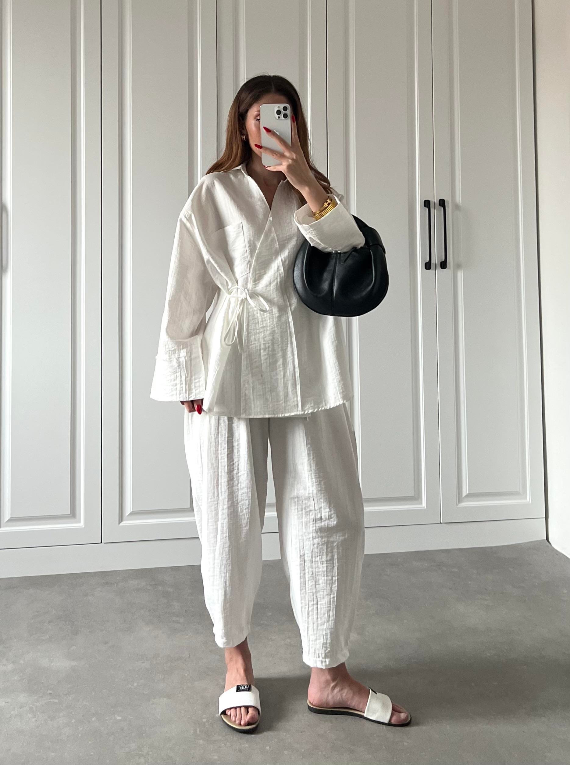 Beyaz Yandan Bağlamalı Coton Kimono Takım
