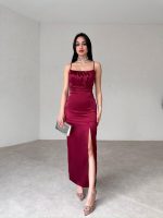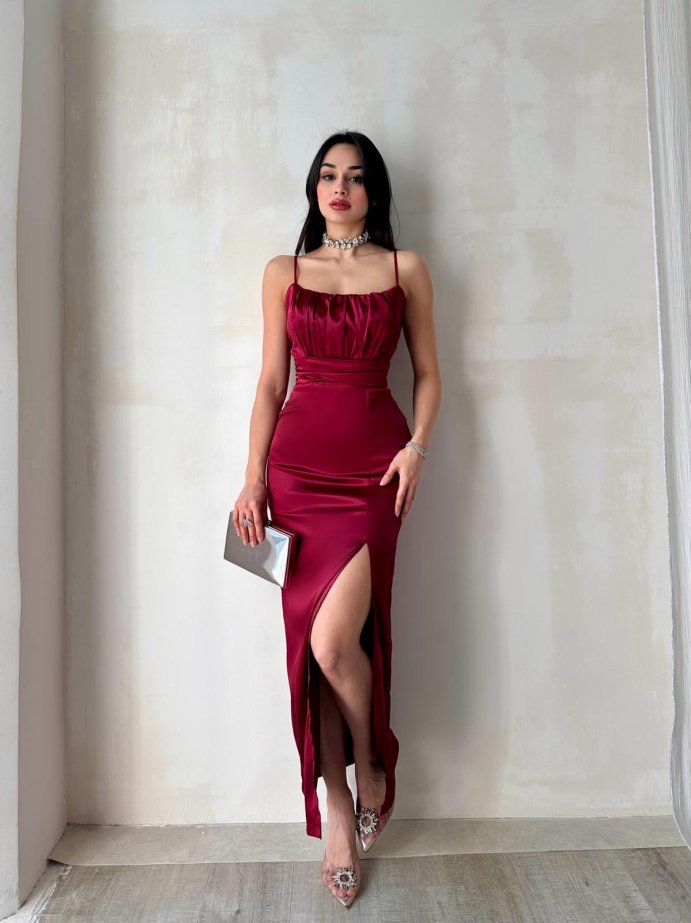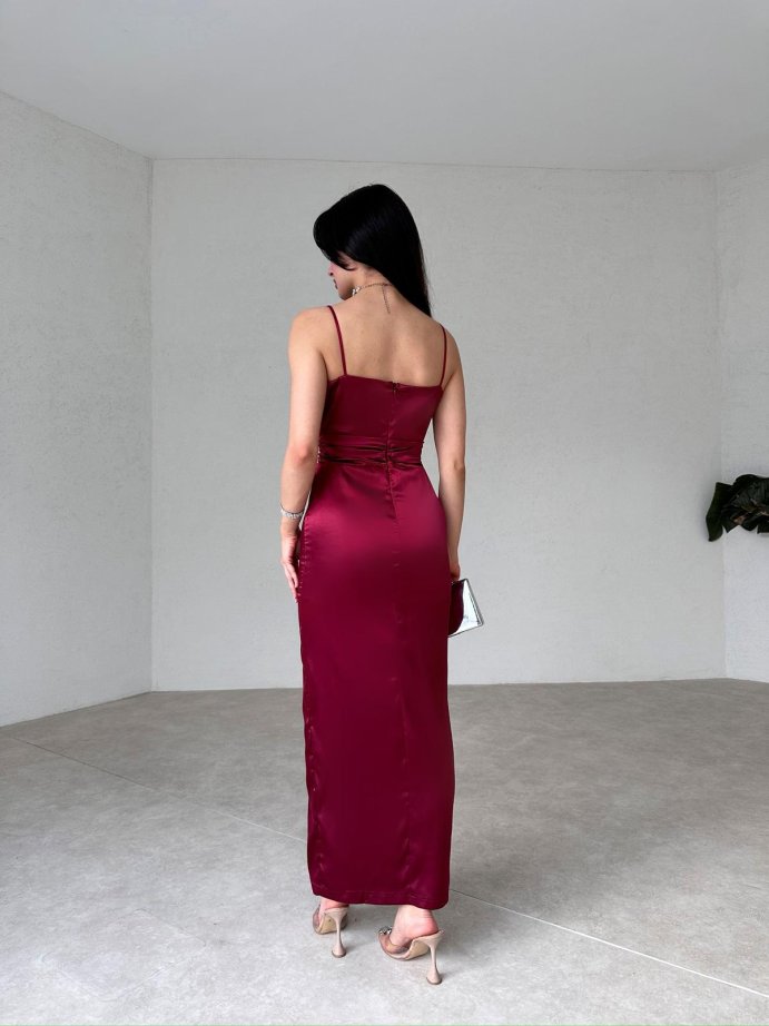 Ana Sayfa ÇOK SATANLAR Bordo İnce Askılı Göğüsü Drapeli Vencover Saten Elbise