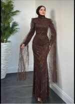 Brunella Pelerinli Taş İşlemeli Balık Model Abiye Kahverengi