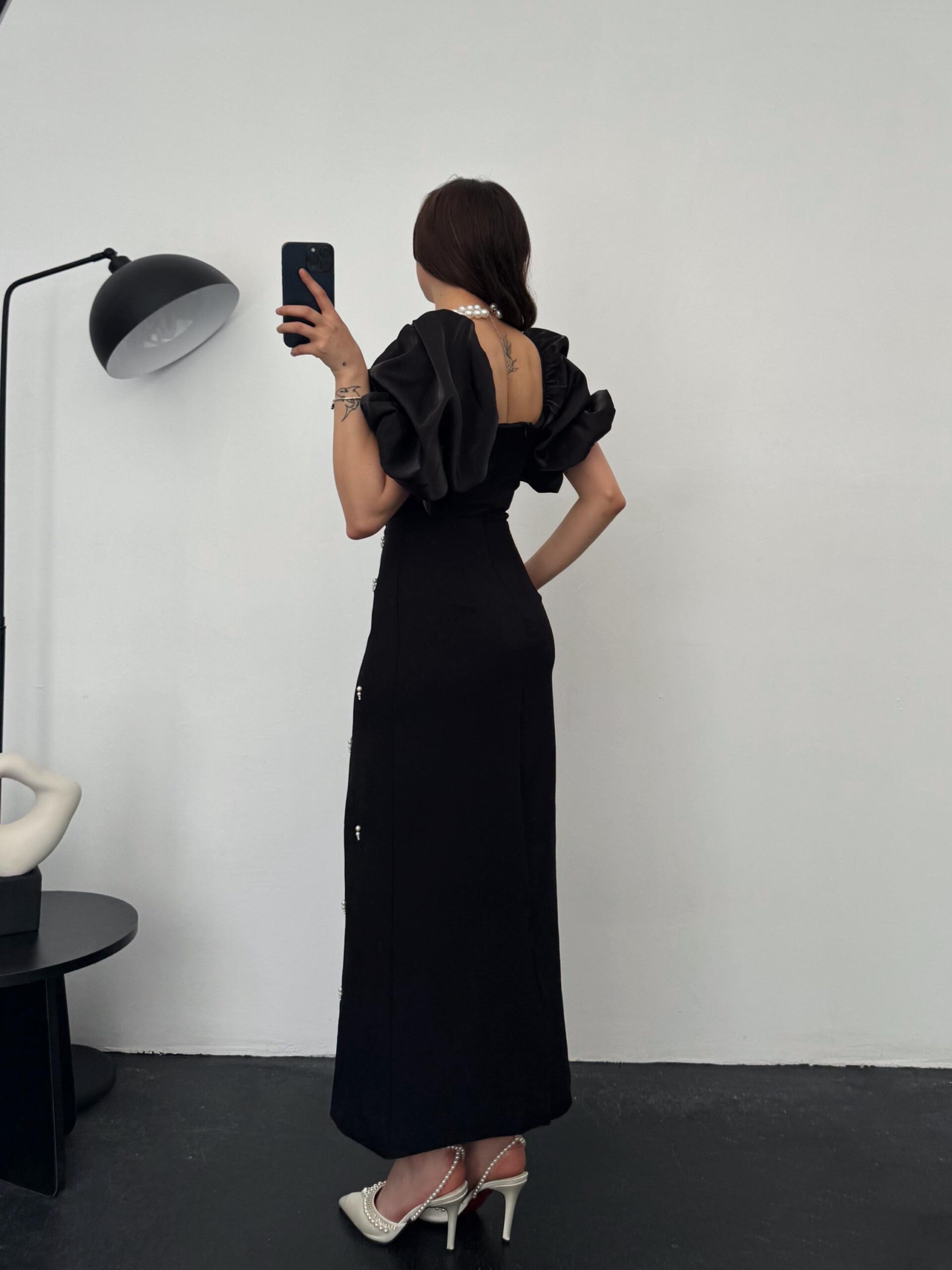 Calenda Balon Kol İnci Detay Siyah Elbise