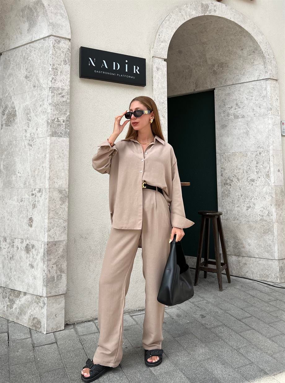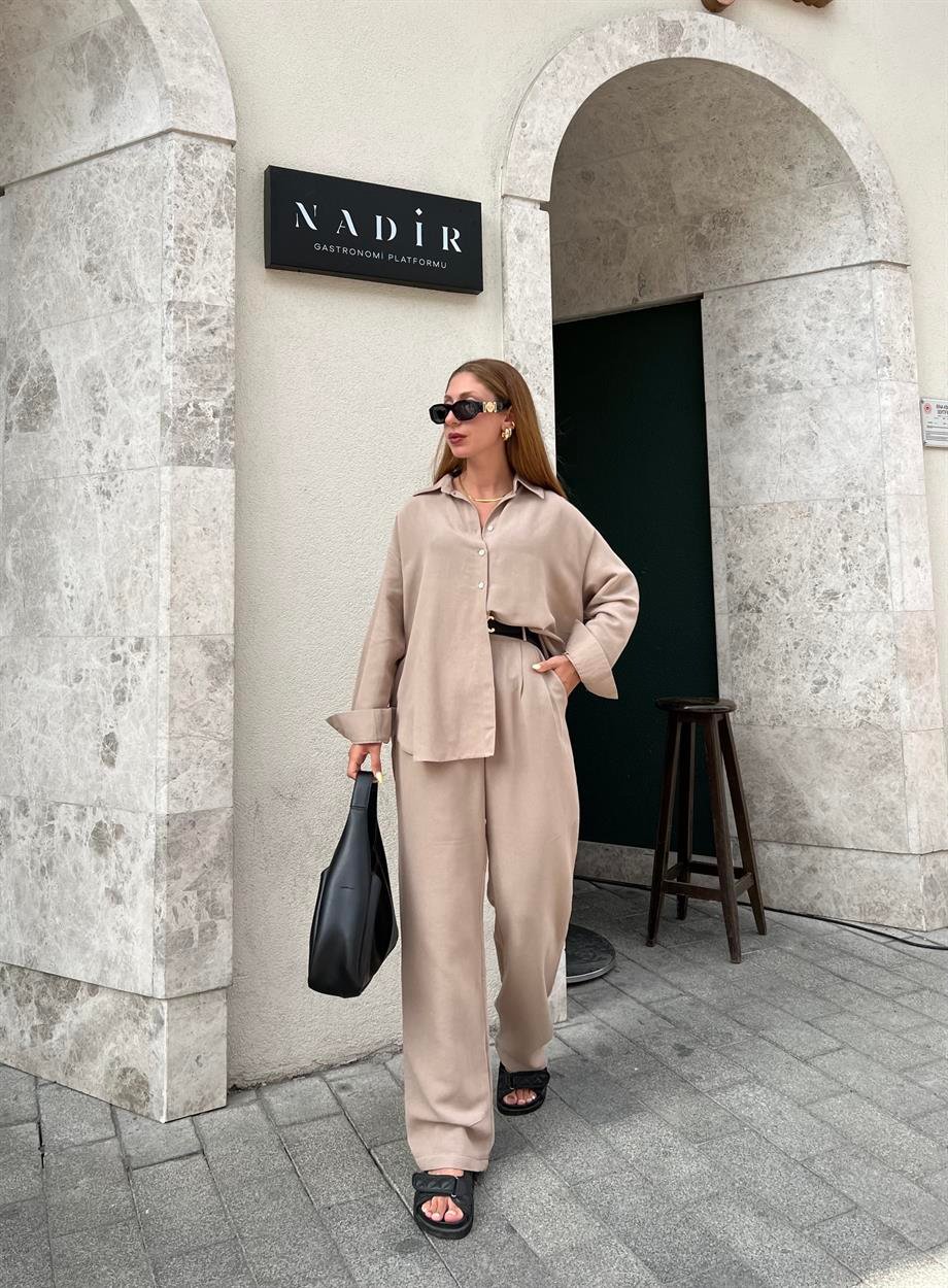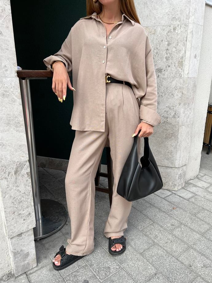 Taş Rengi Keten Palazzo İkili Takım