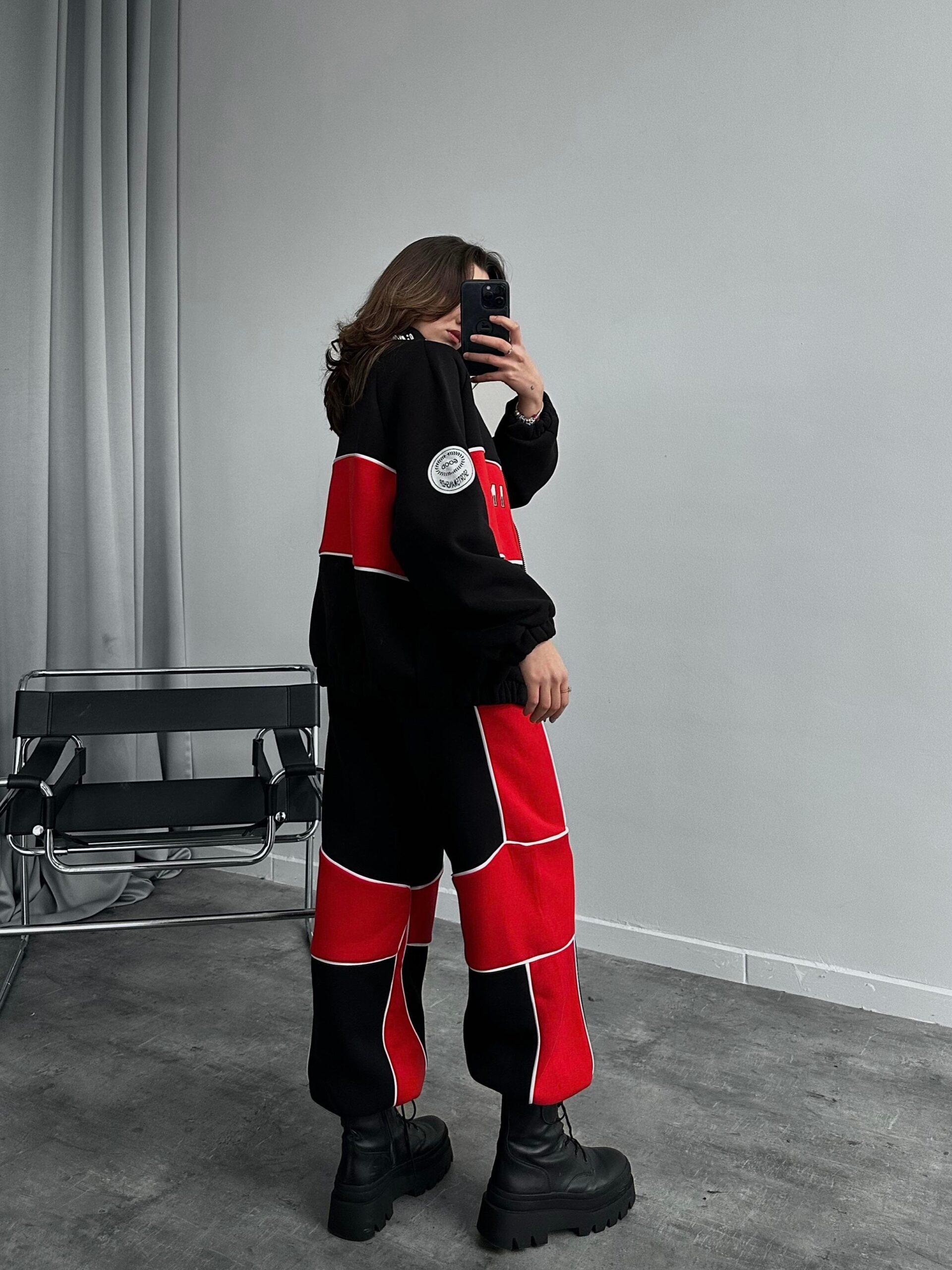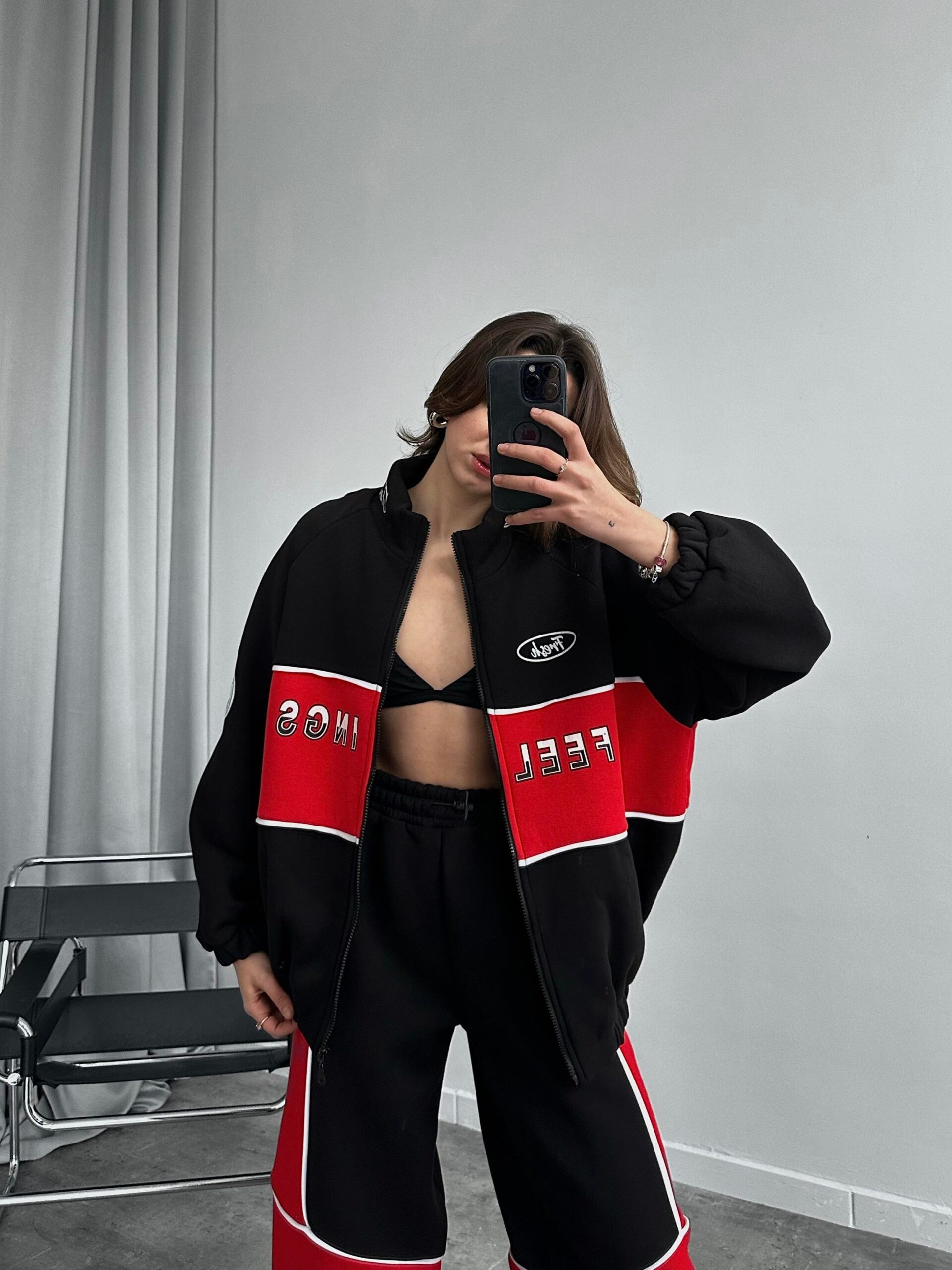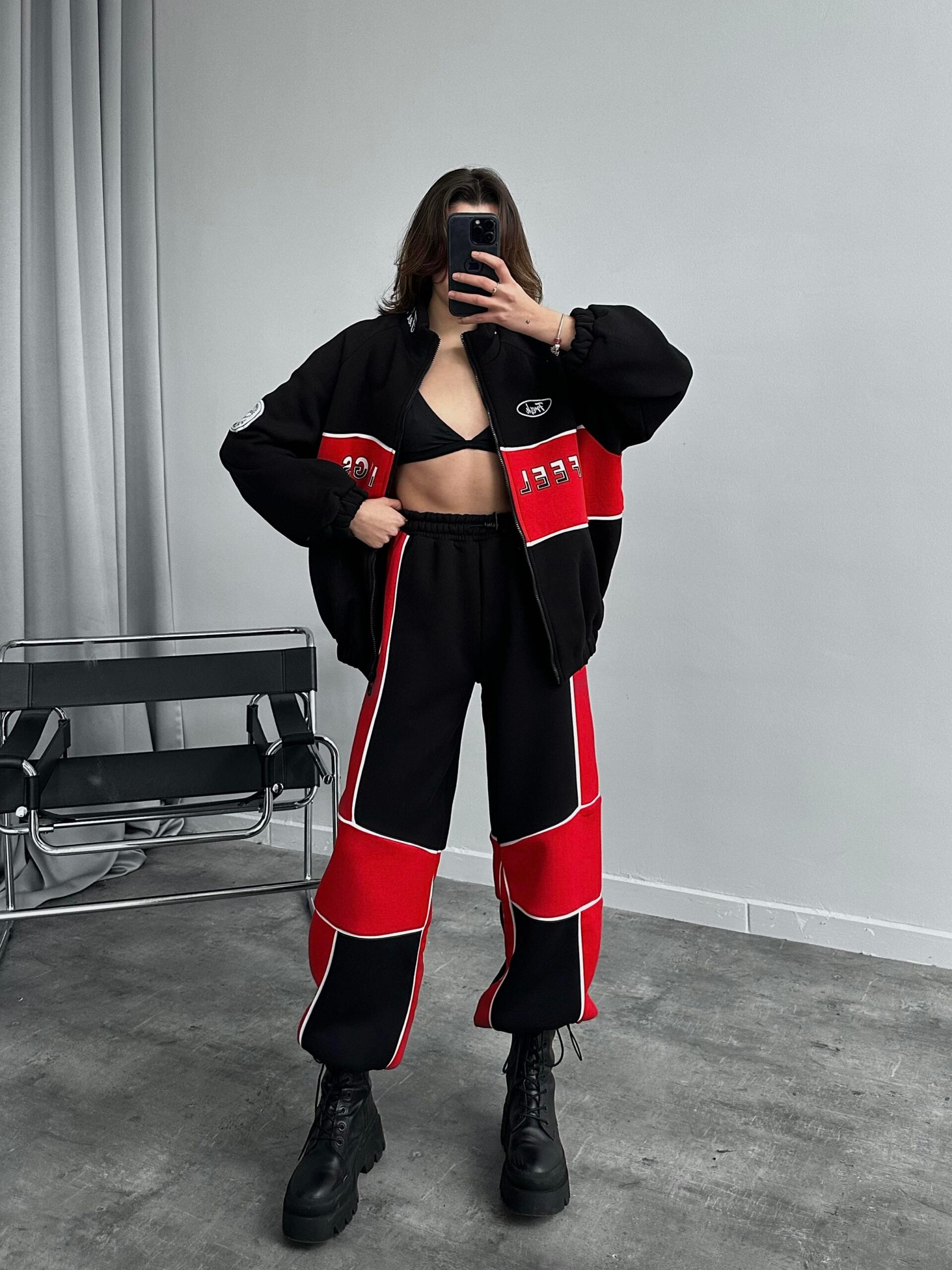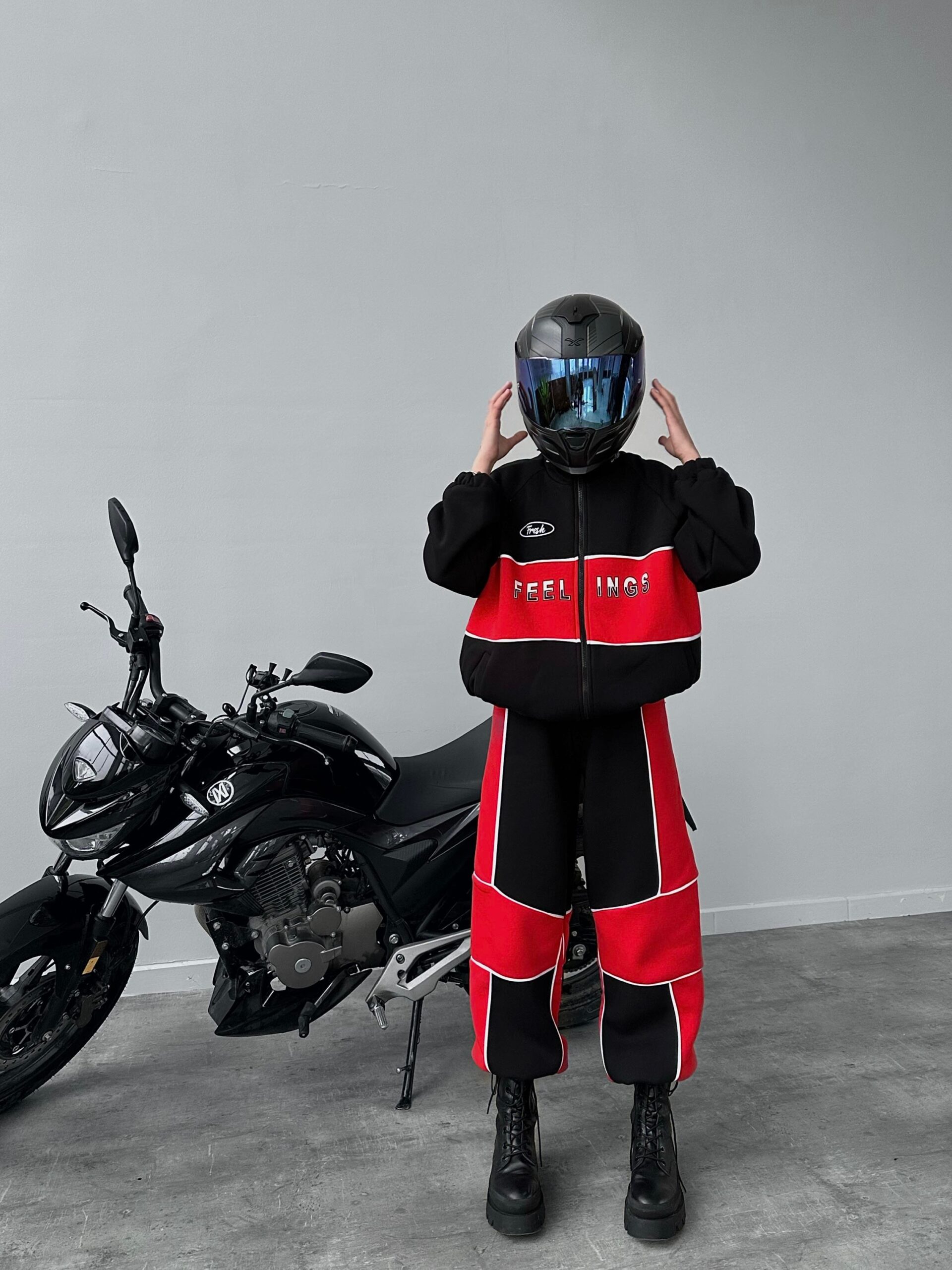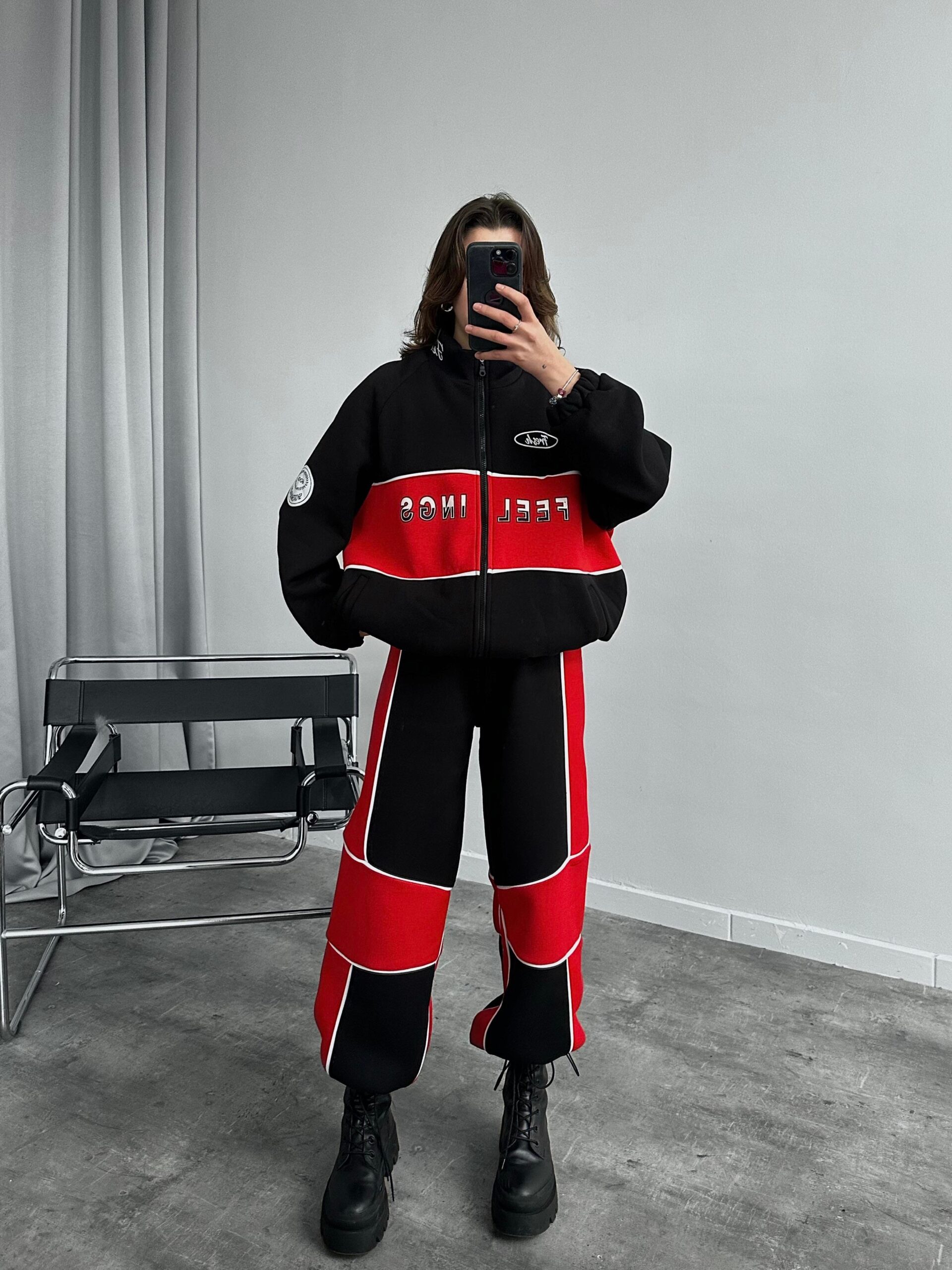 Drill Üç İplik Şardonlu Kırmızı Hırkalı Eşofman Takımı