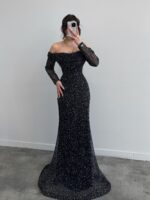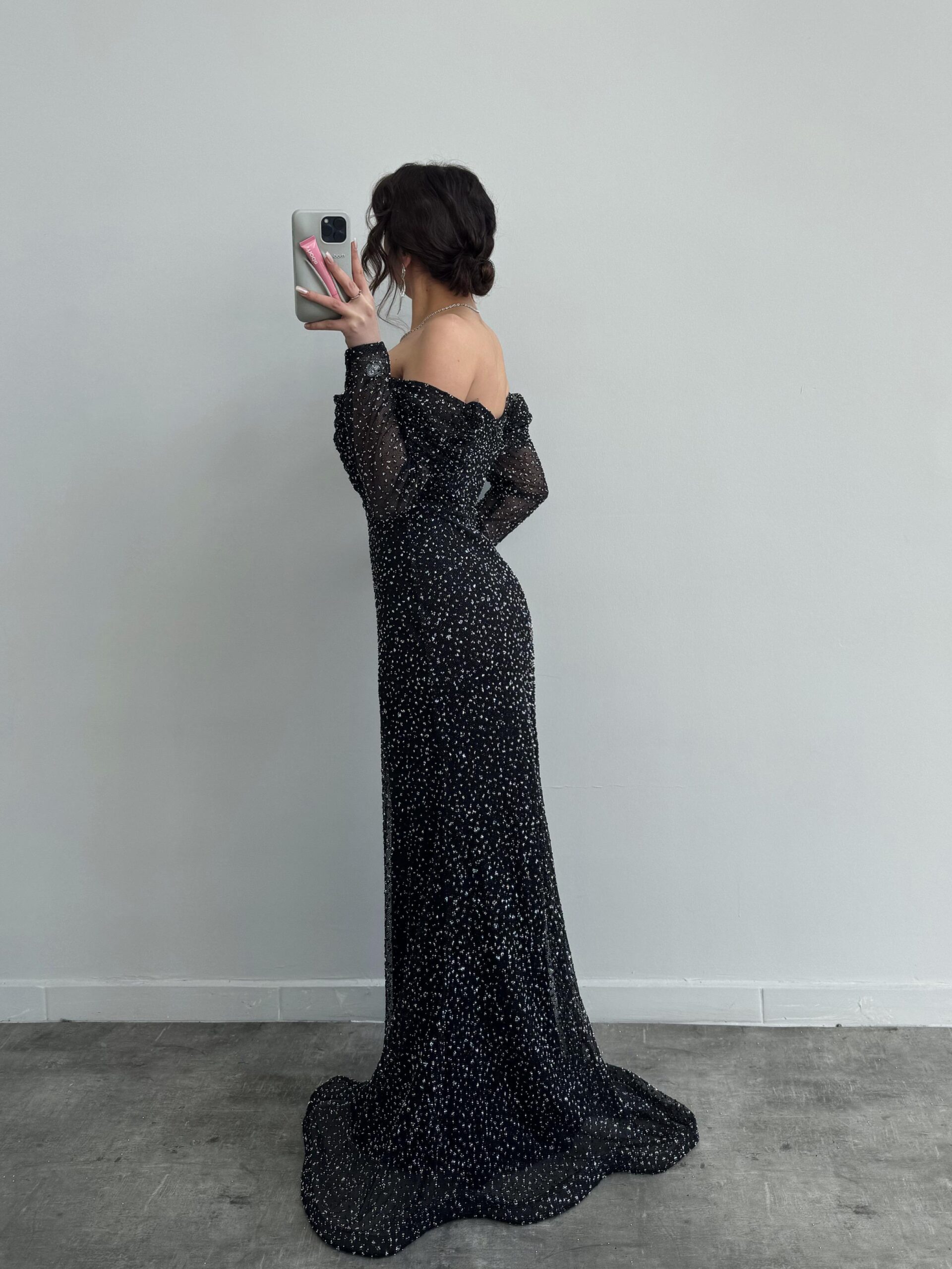 Ellinor Kayık Yaka Taşlı Siyah Abiye