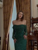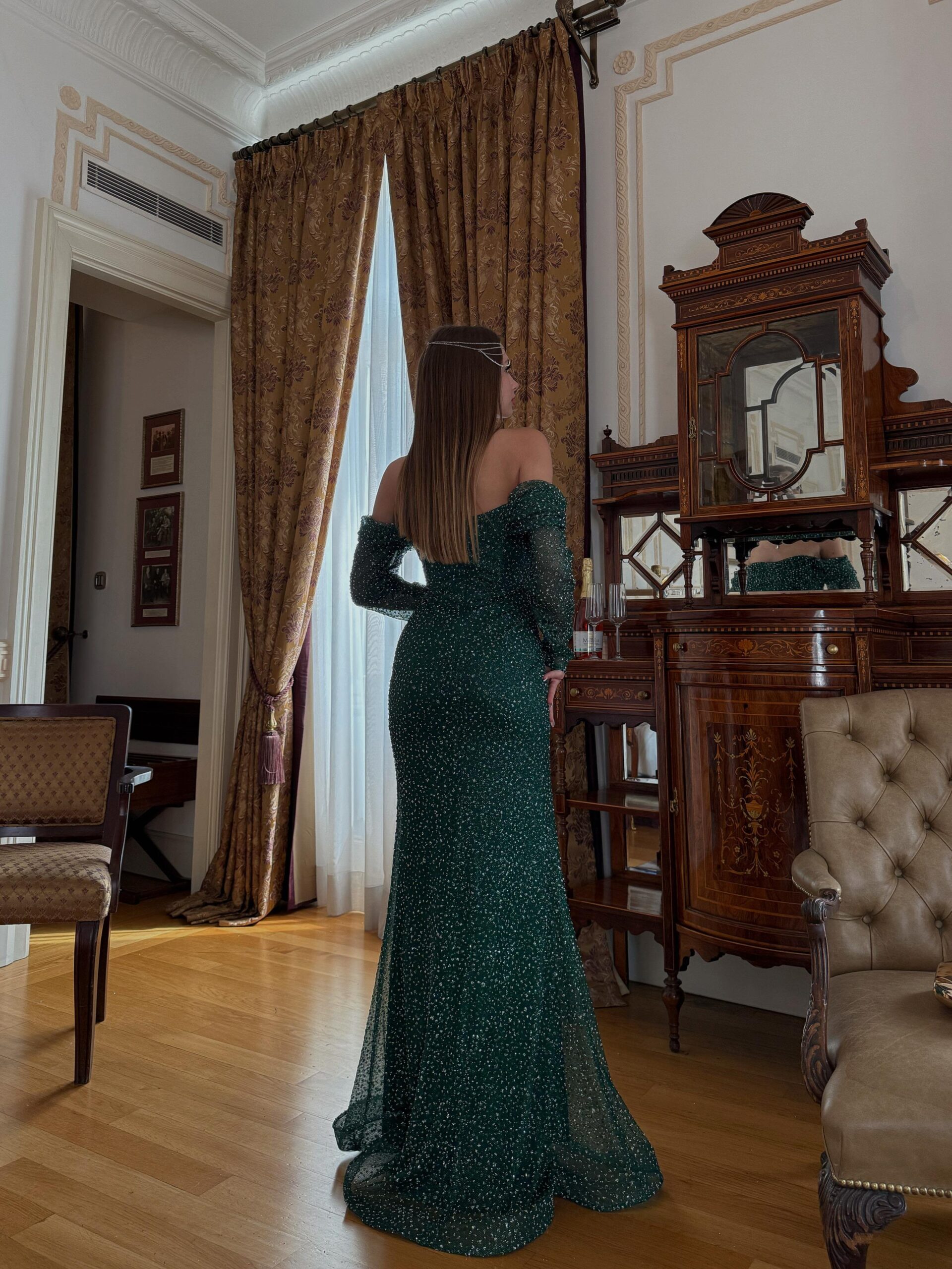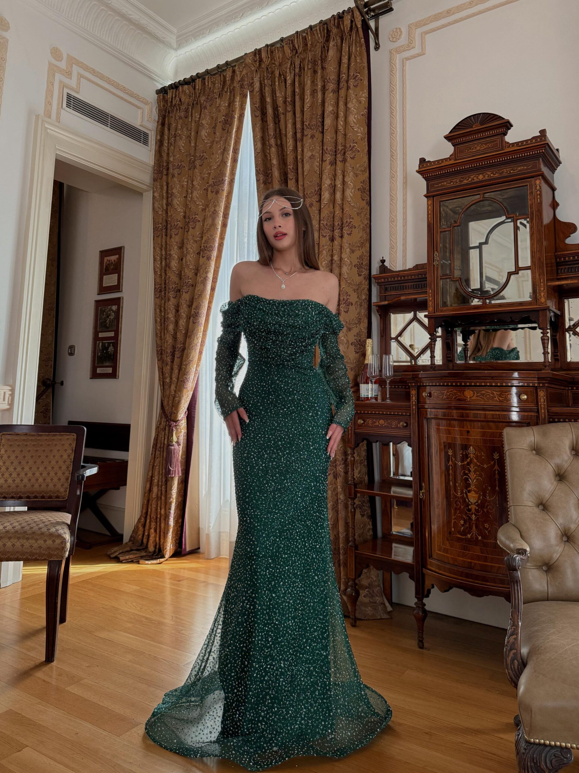 Ellinor Kayık Yaka Taşlı Yeşil Abiye