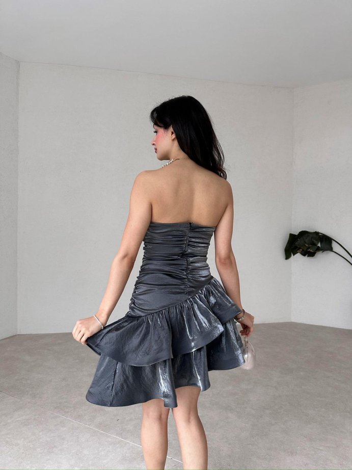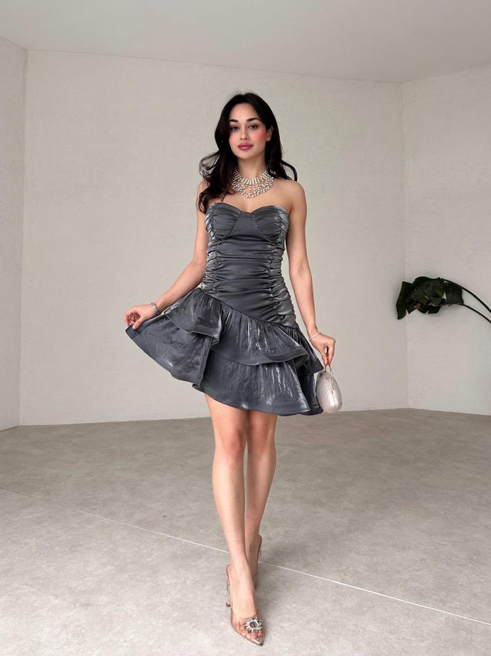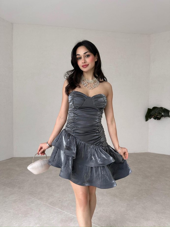 Asimetrik Etekli Mini BİLLY Elbise tam kalıplıdır.