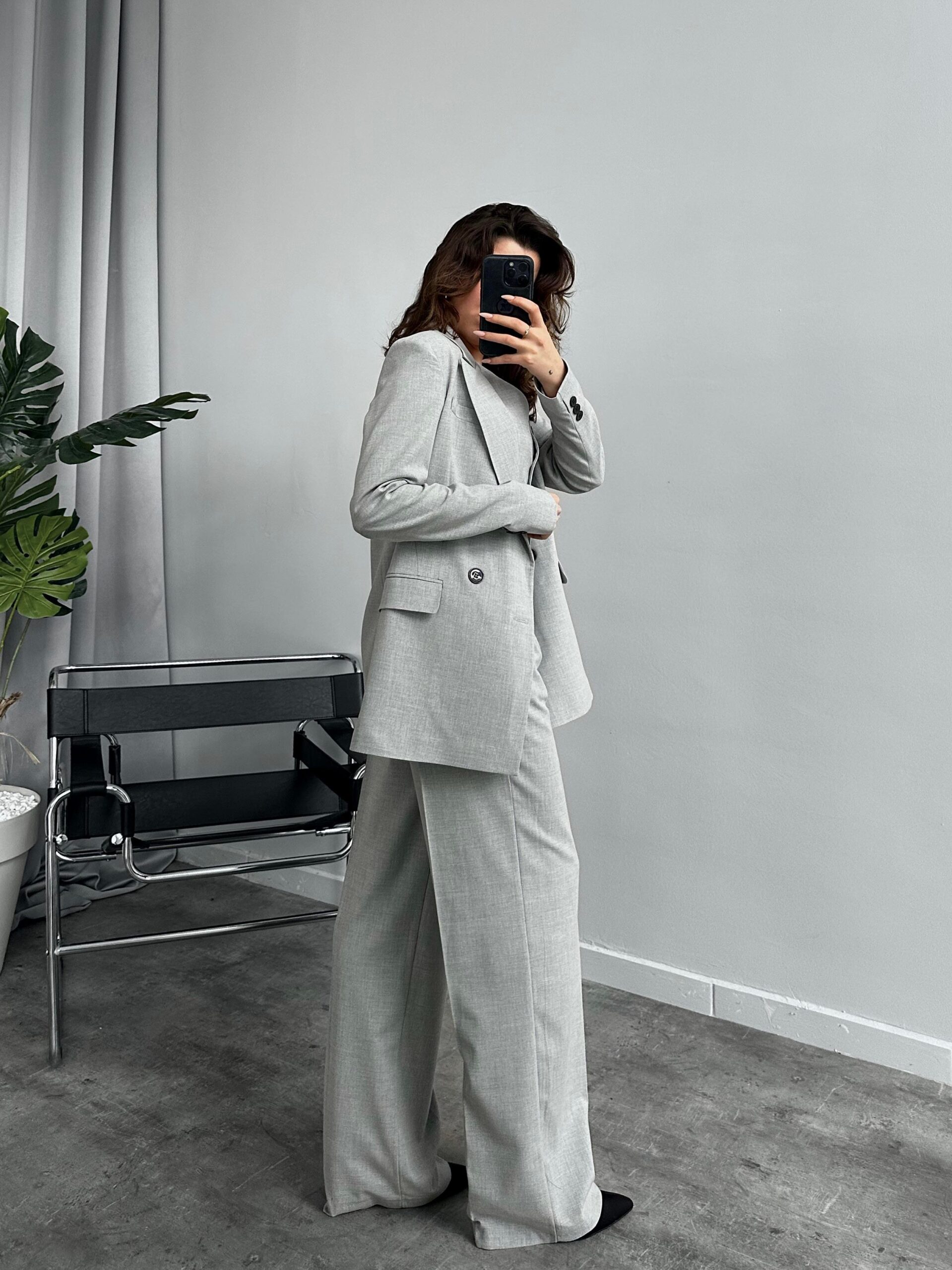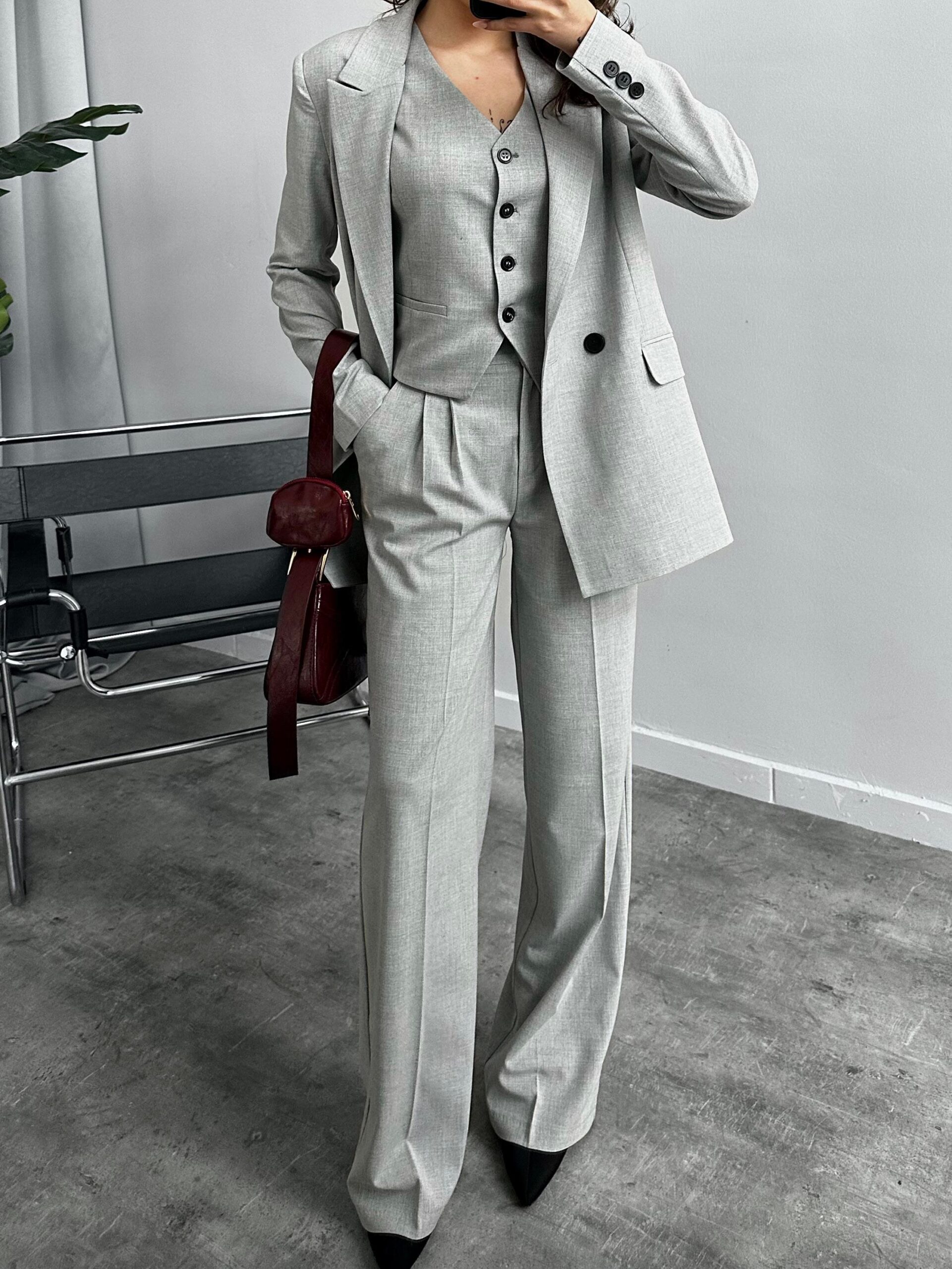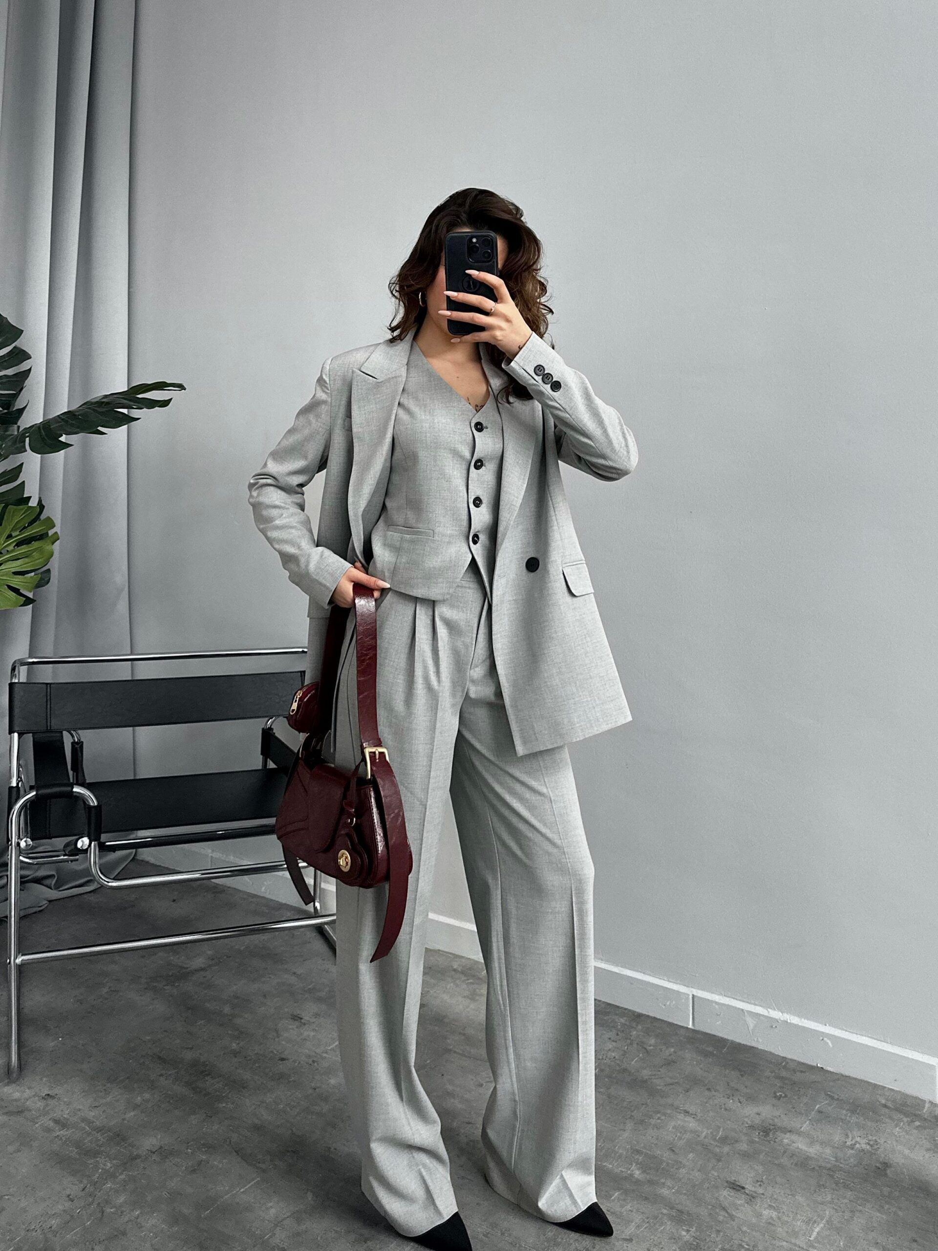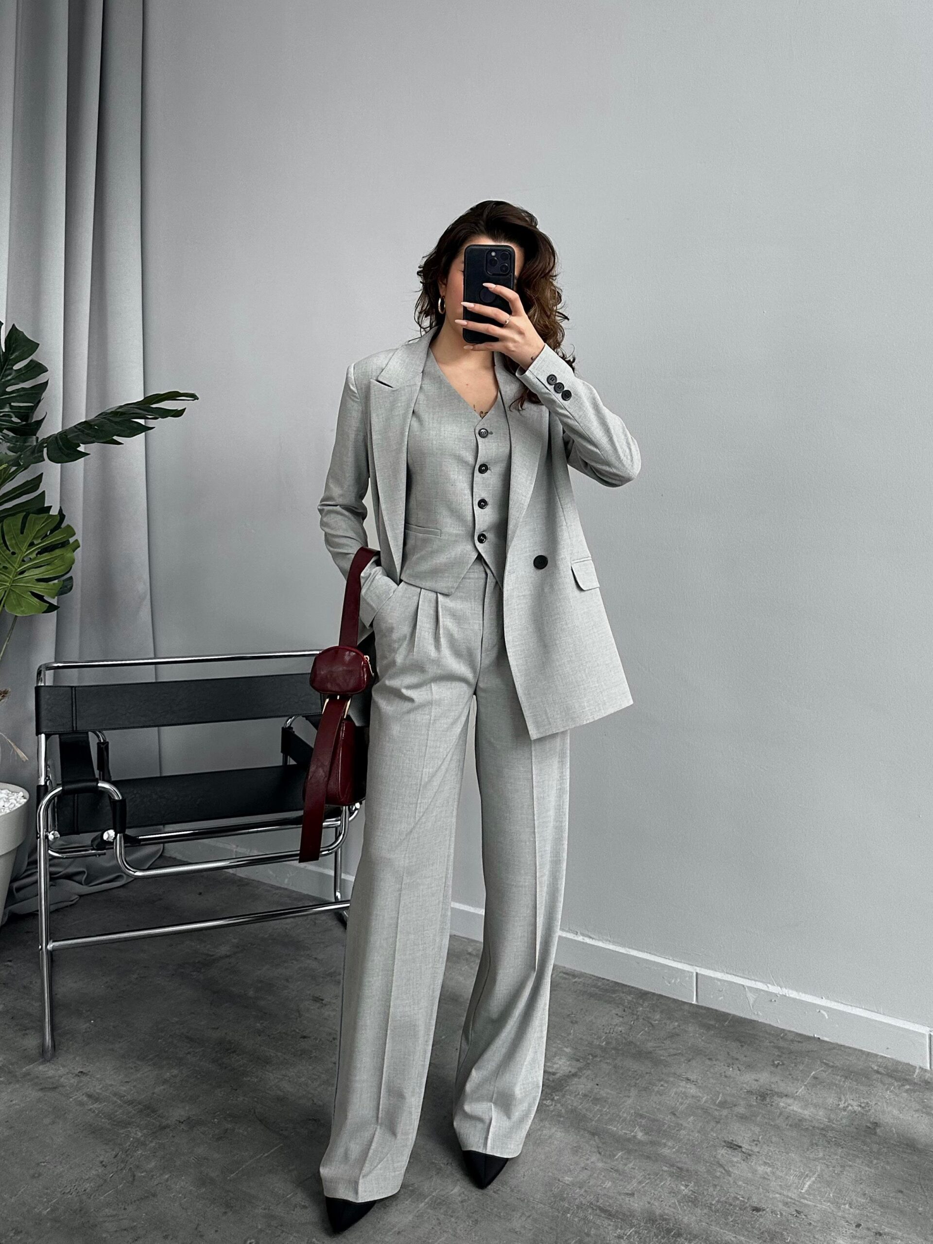 Gri Flay 3 lü Yelekli Çizgili Blazer Takım