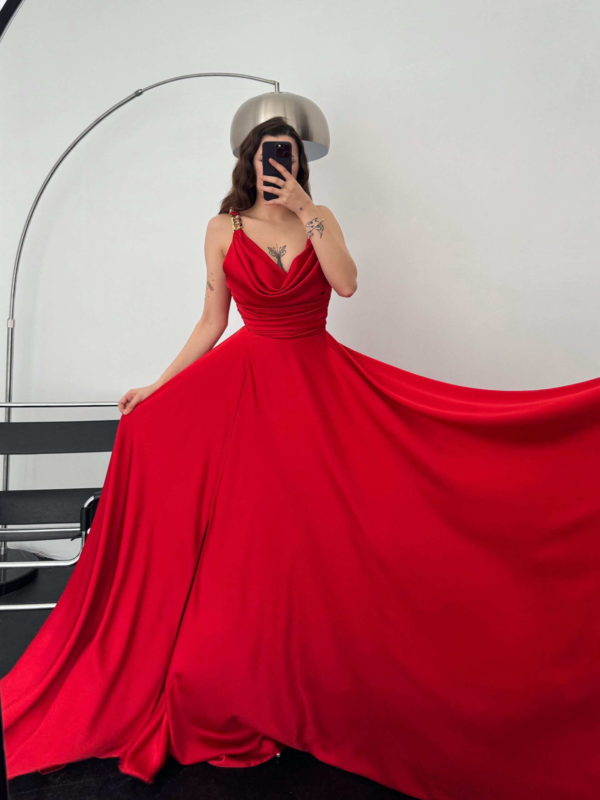Gustav Degaje Yaka Askıları Zincir Detay Kırmızı Abiye