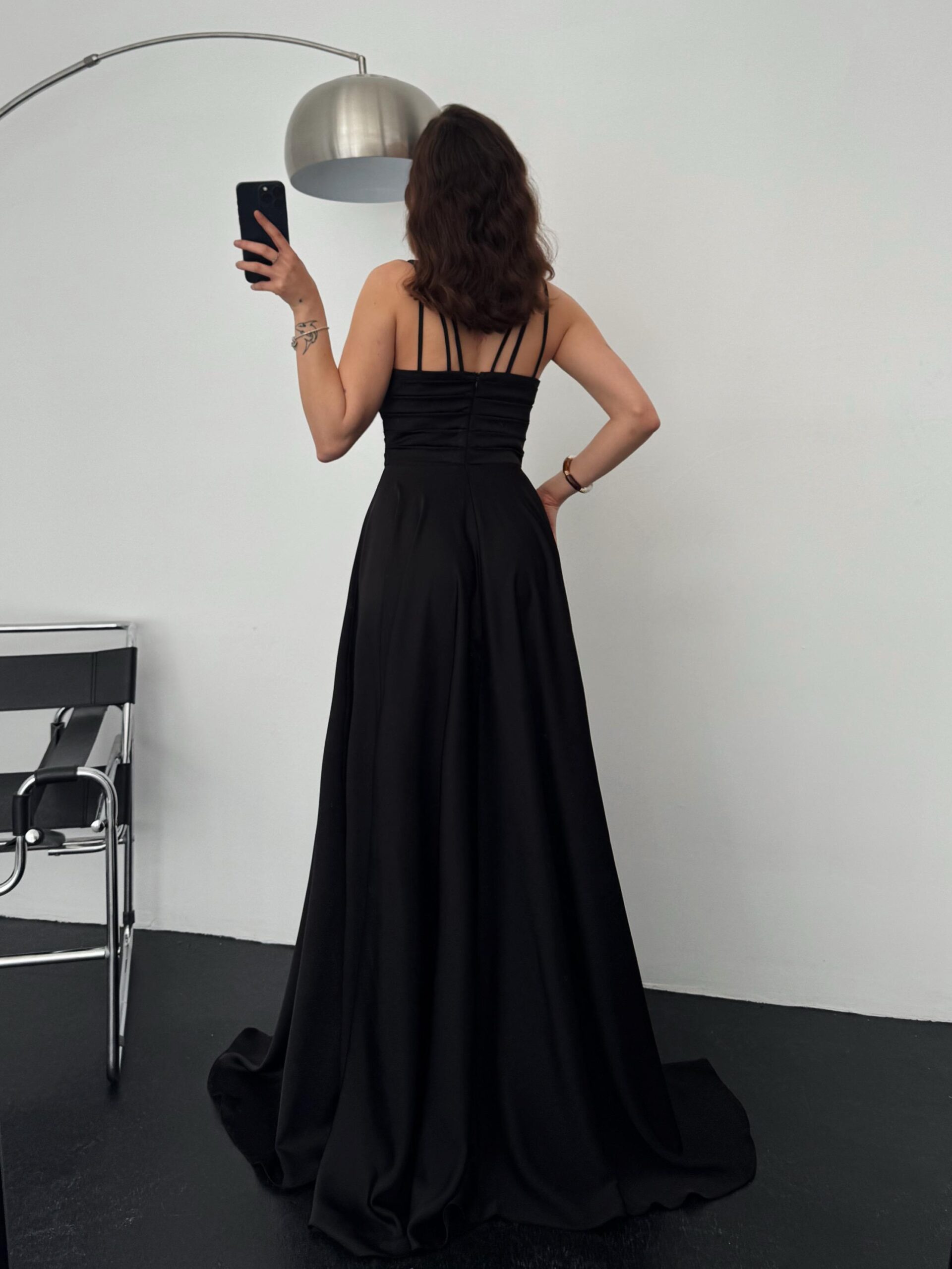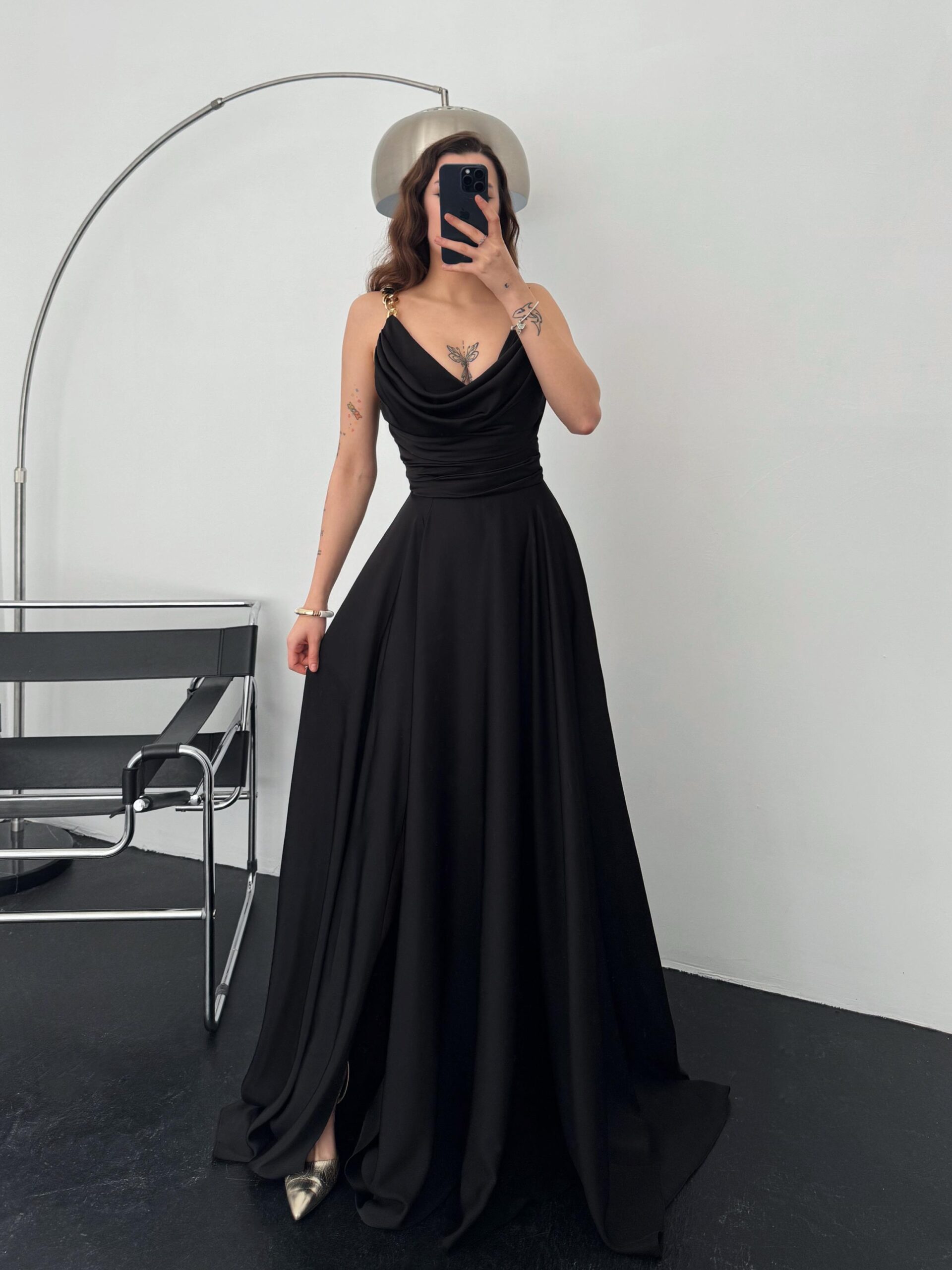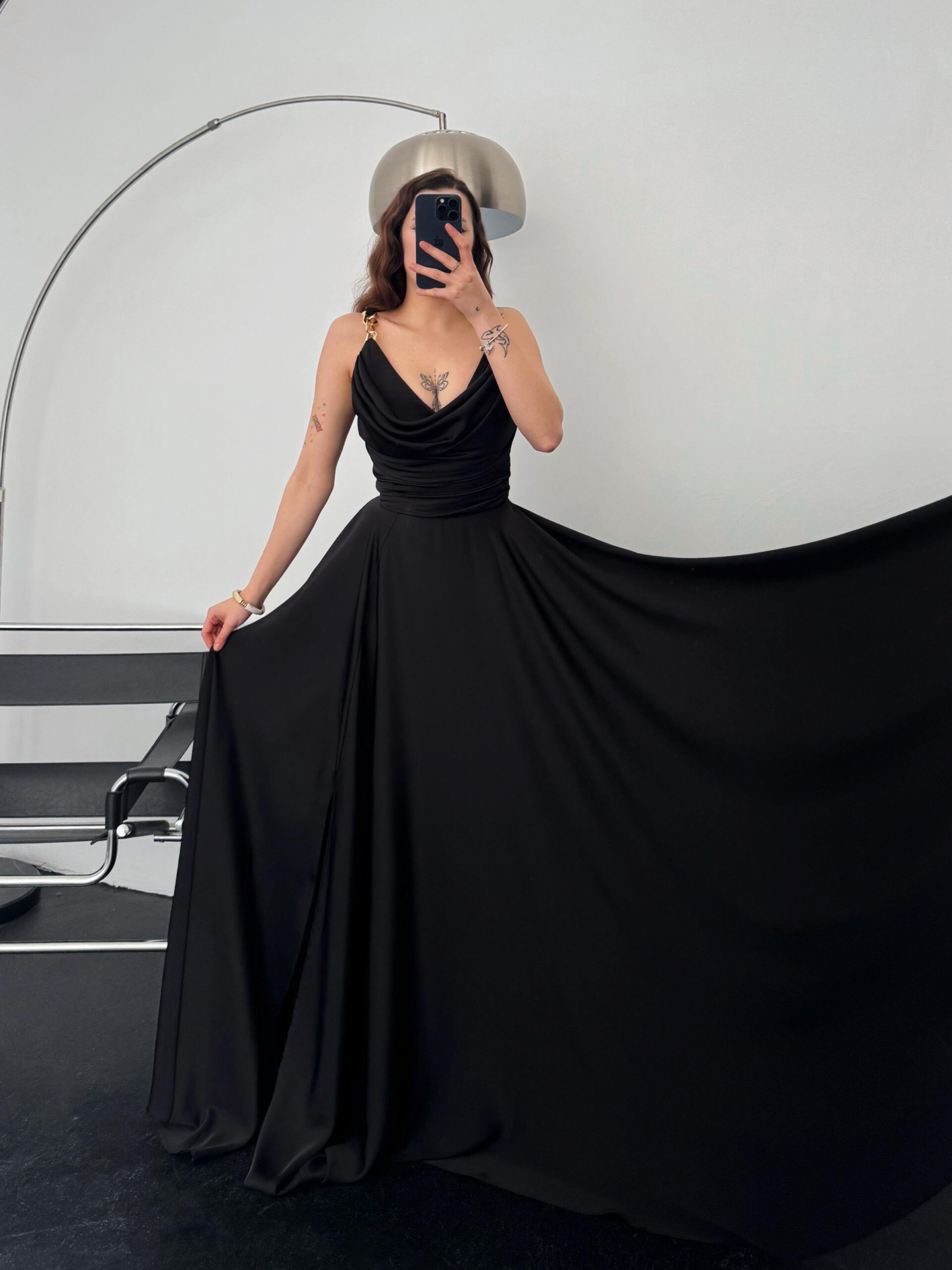 Gustav Degaje Yaka Askıları Zincir Detay Siyah Abiye
