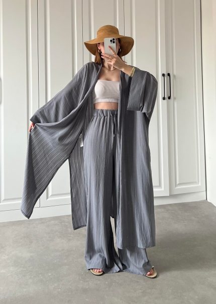 Antrasit Maxi Uzun Gofre Kimono Takım