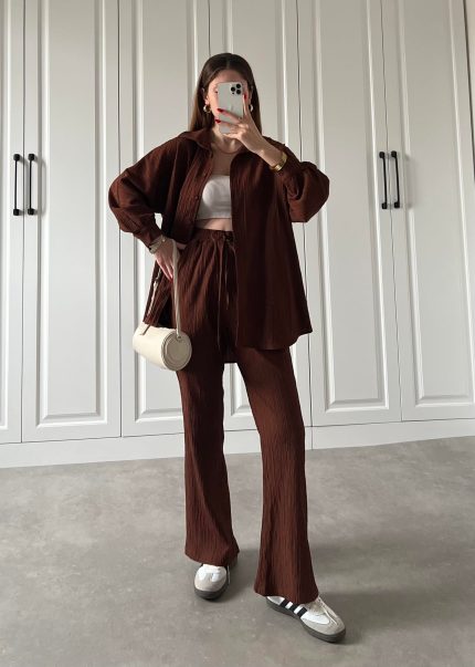 Kahve Beli Kemerli Gofre İkili Takım