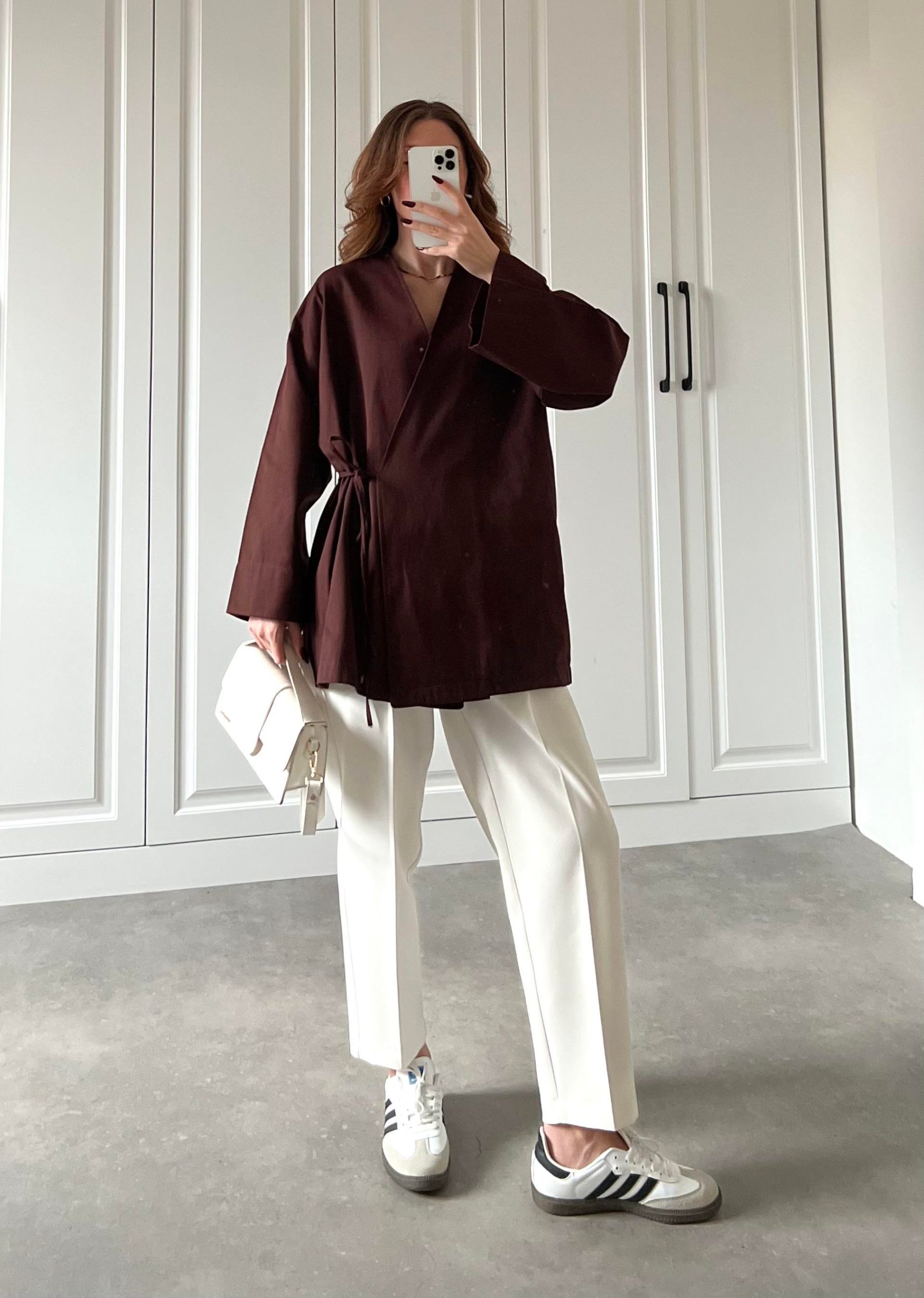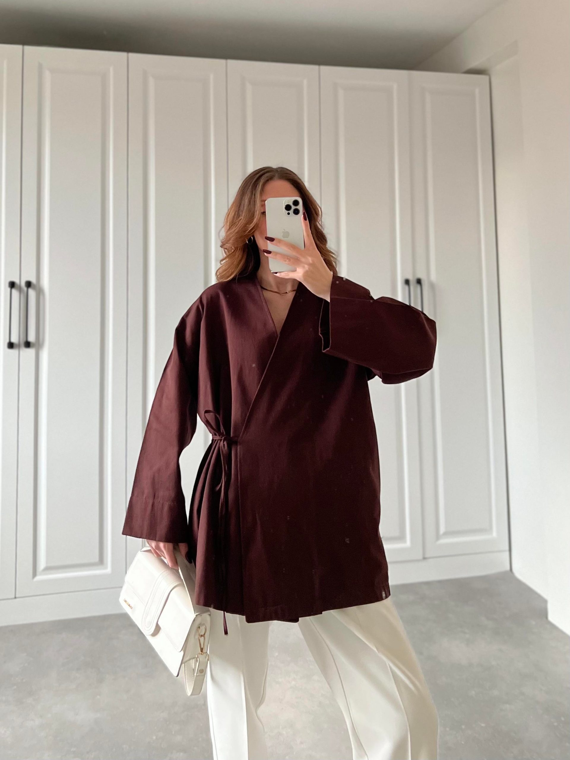 Kahve Yandan Bağlamalı Gabardin Kimono Ceket