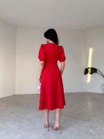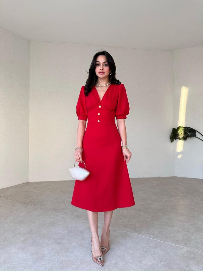 Kırmızı İnci Düğme Detaylı Yarım Kol Midi GABRİEL Elbise