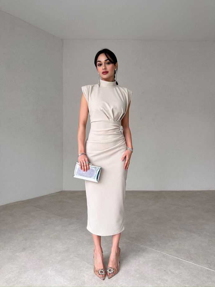 Broş Aksesuarlı Midi SİLANA Elbise tam kalıplıdır.