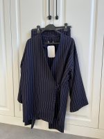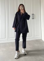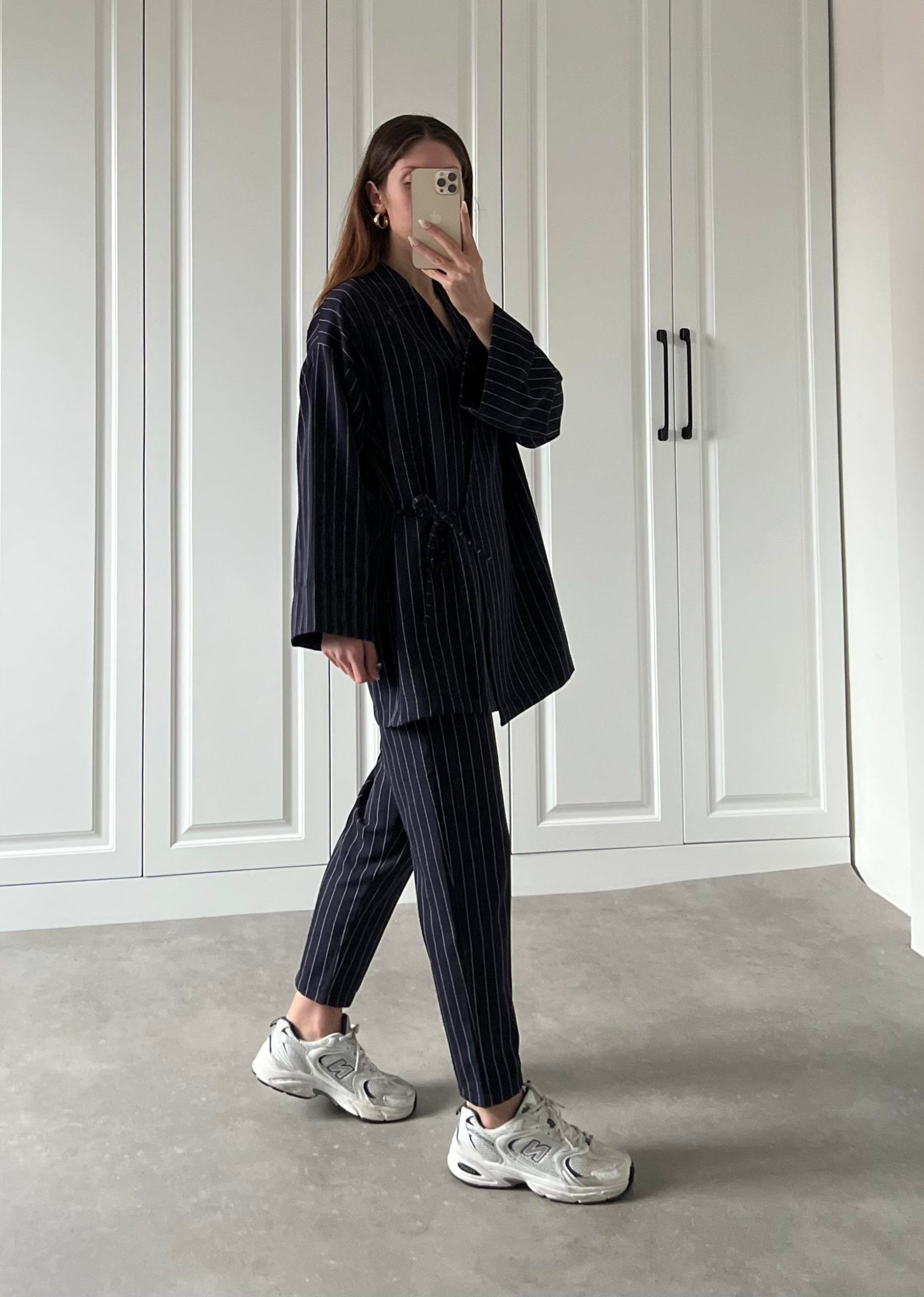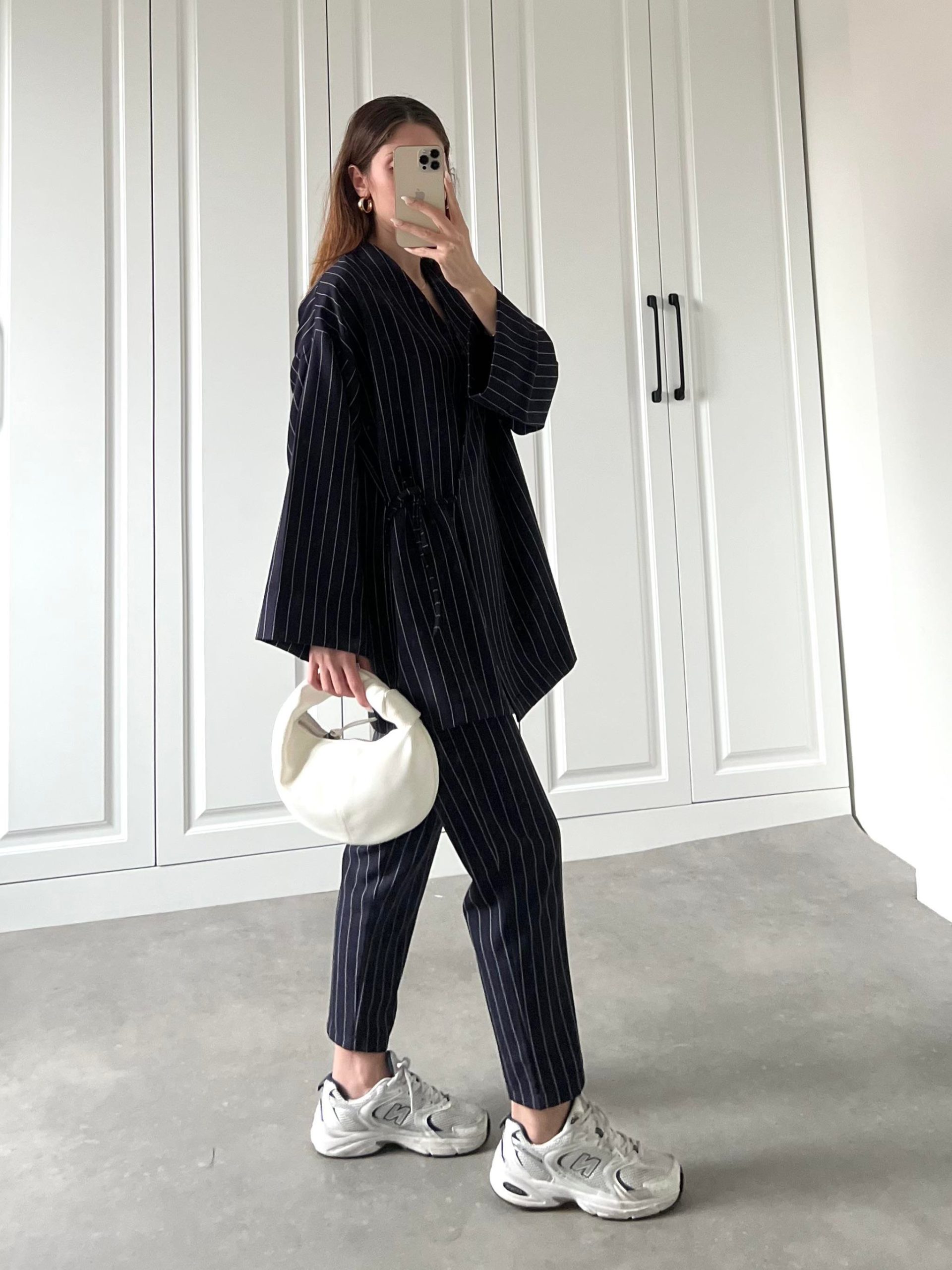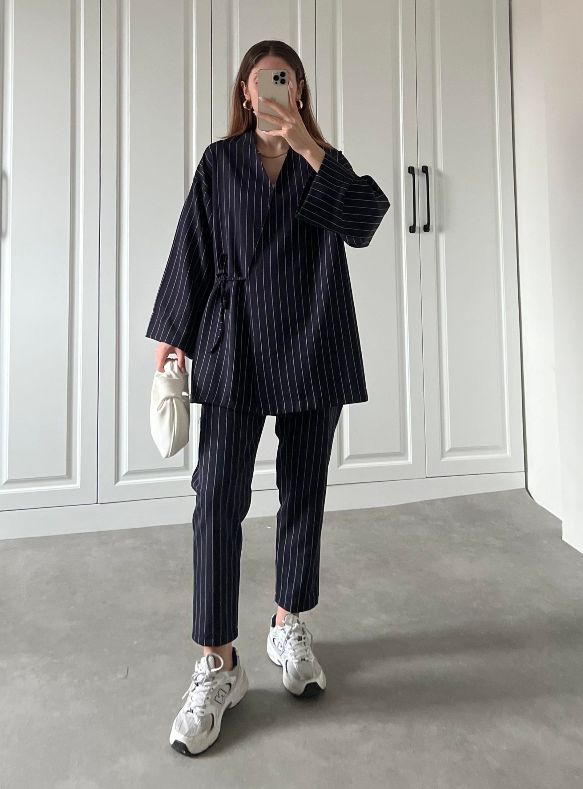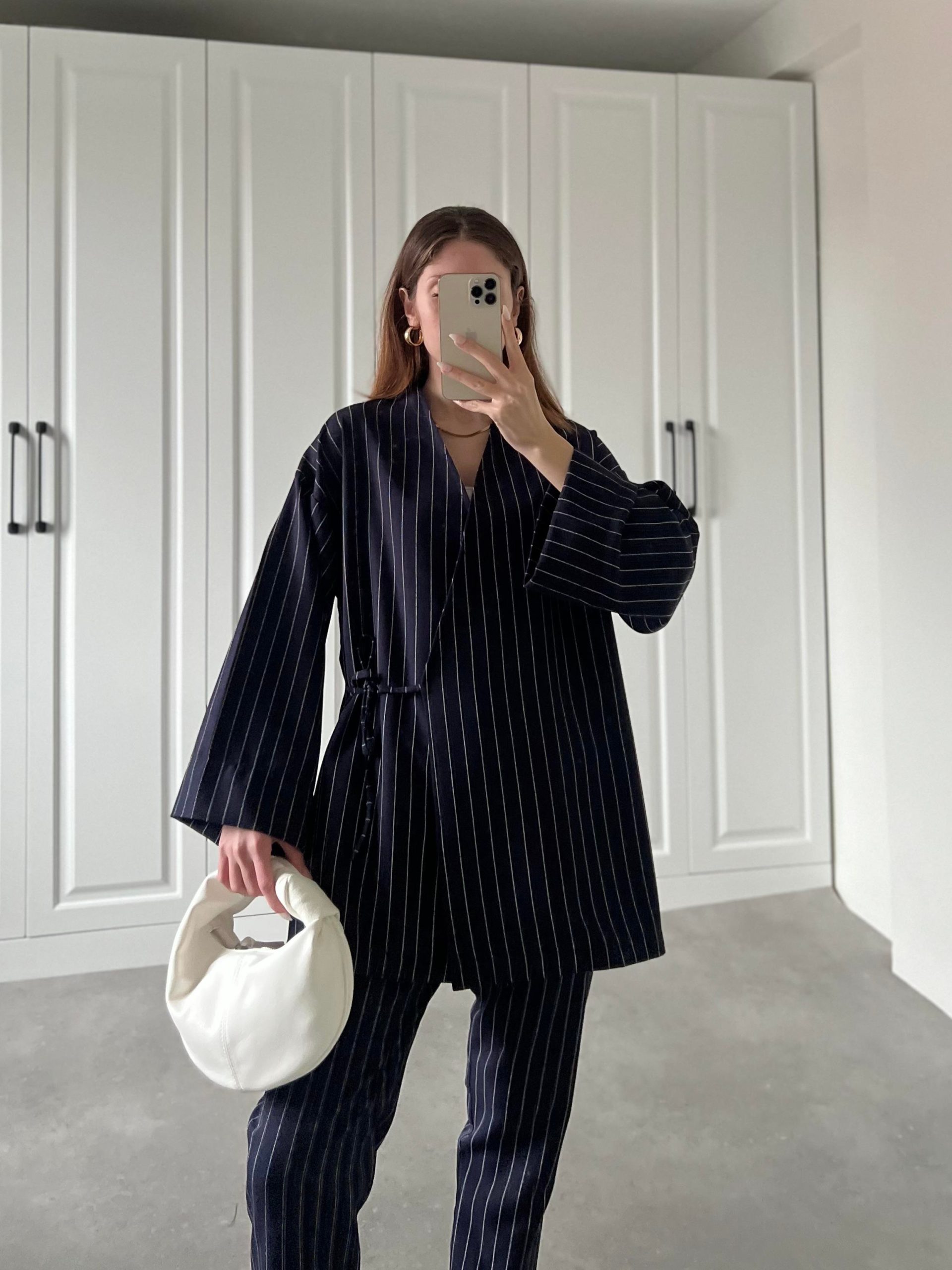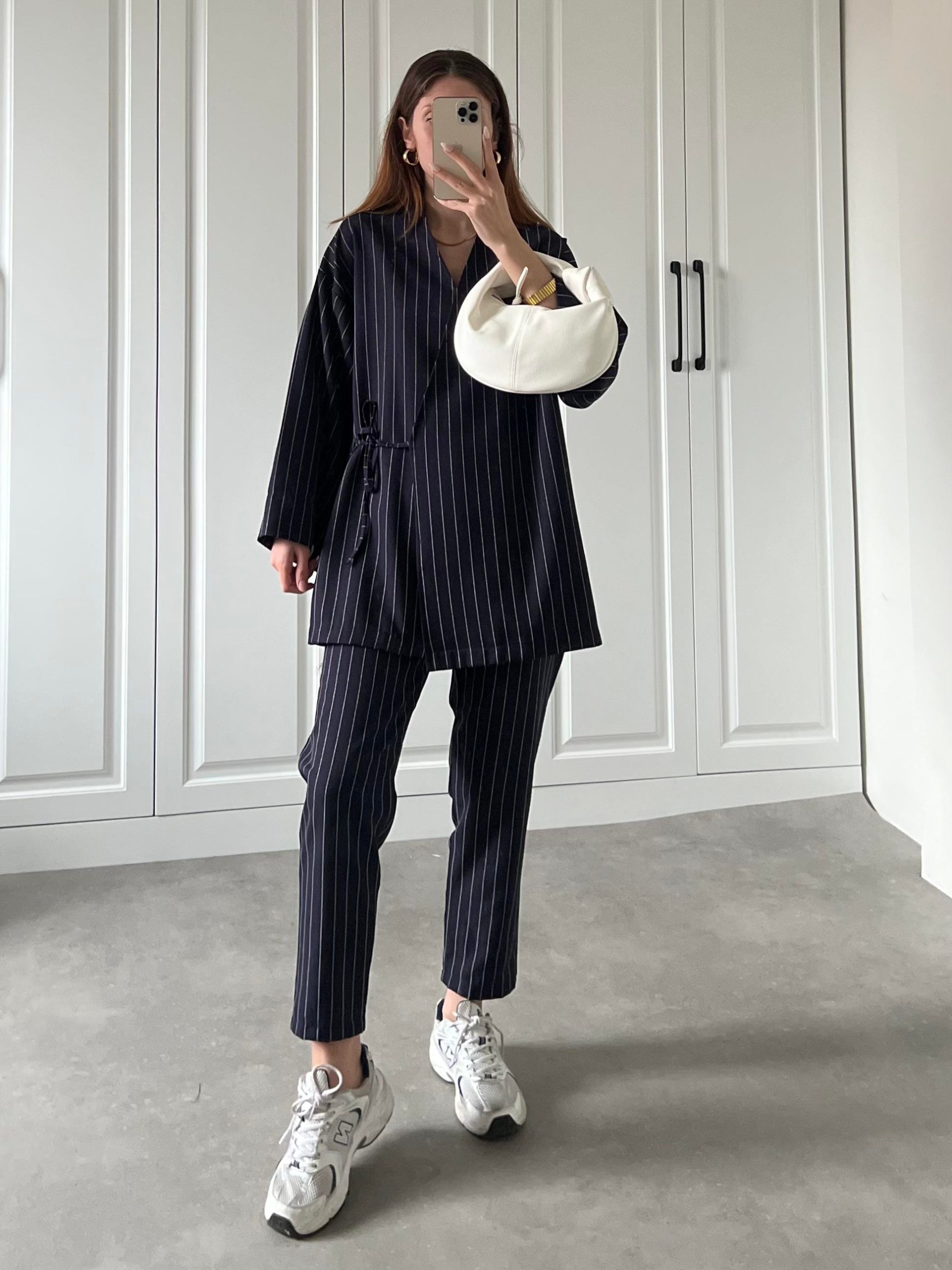 Ana Sayfa Yeni Sezon Lacivert Çizgili Premium Bağlamalı Kimono Takım