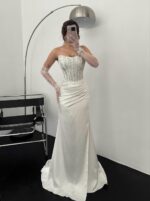 Lady Straplez Korse Detay Taşlı Beyaz Abiye
