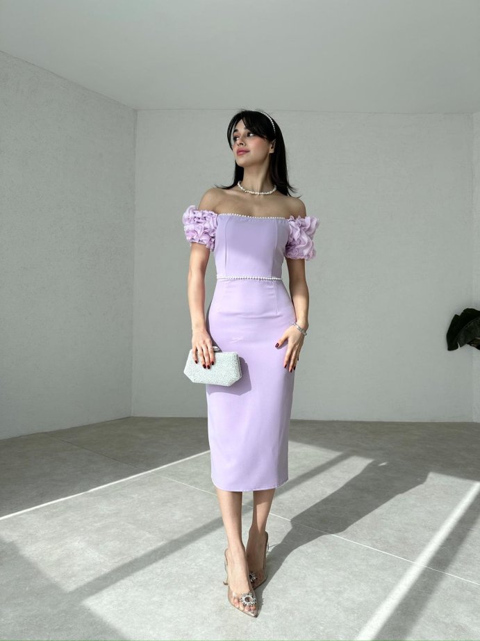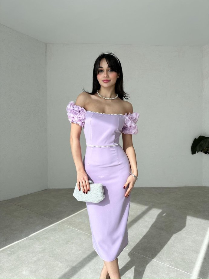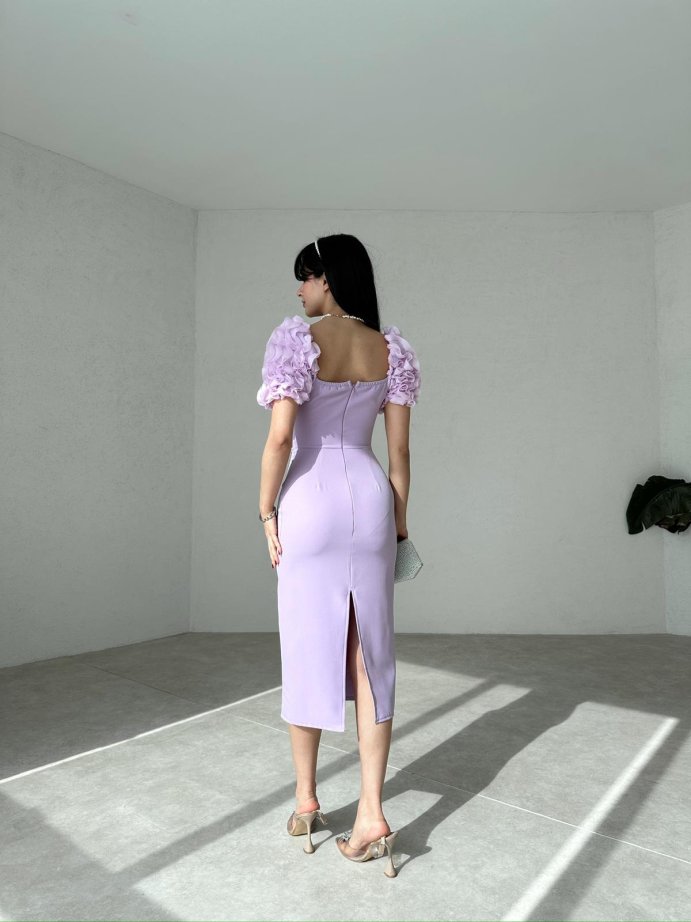 Lila Fırfır Kollu Midi ANJELİKA Elbise