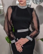 •𝗨̈𝗿𝘂̈𝗻 𝗱𝗲𝘁𝗮𝘆𝗹𝗮𝗿𝗶: Hafif likralı scuba kumaş, kol kumaş jakarlı organze , baget şerit taş detaylı bedenli kemer, arkadan gizli fermuarlı