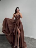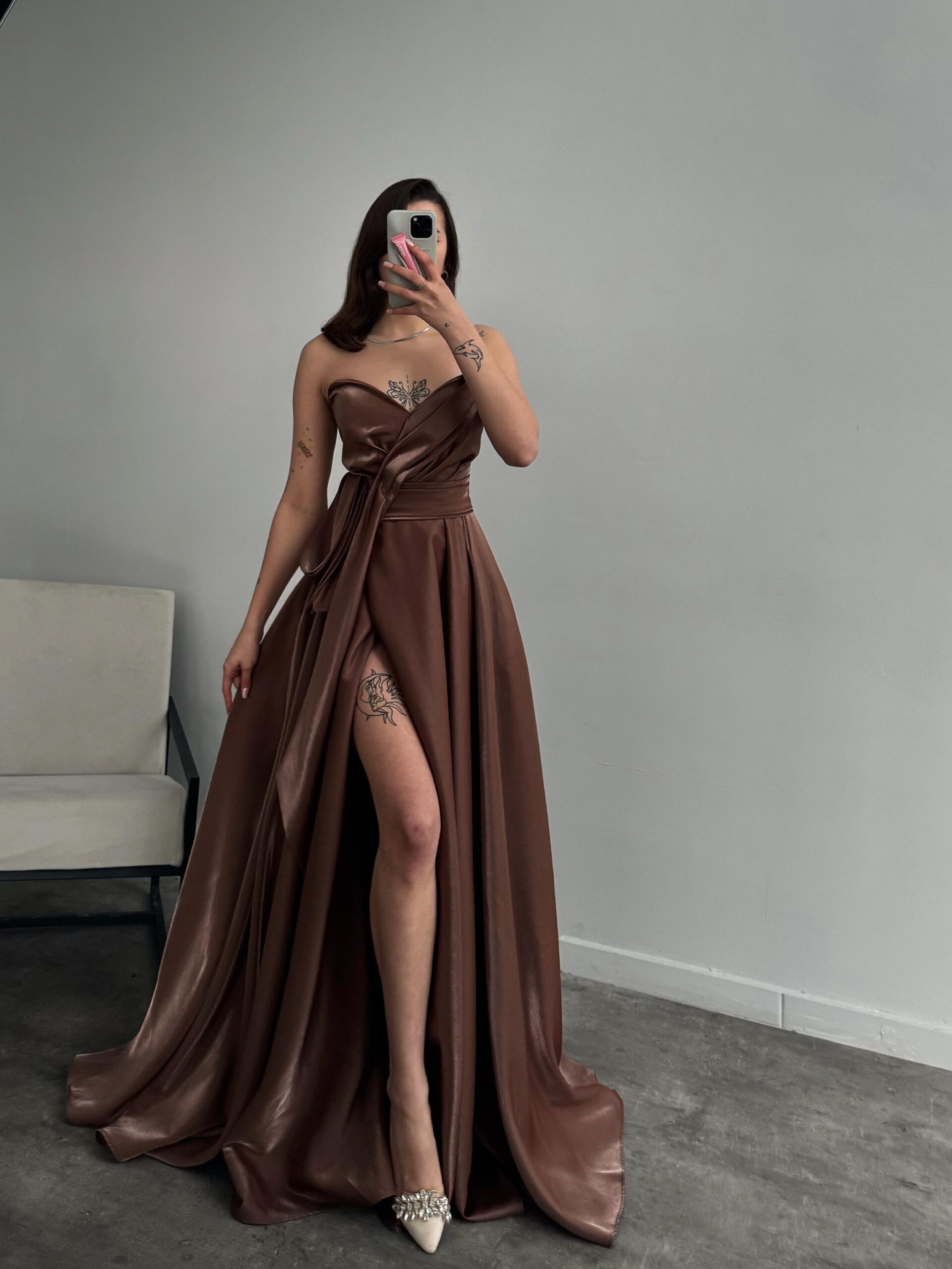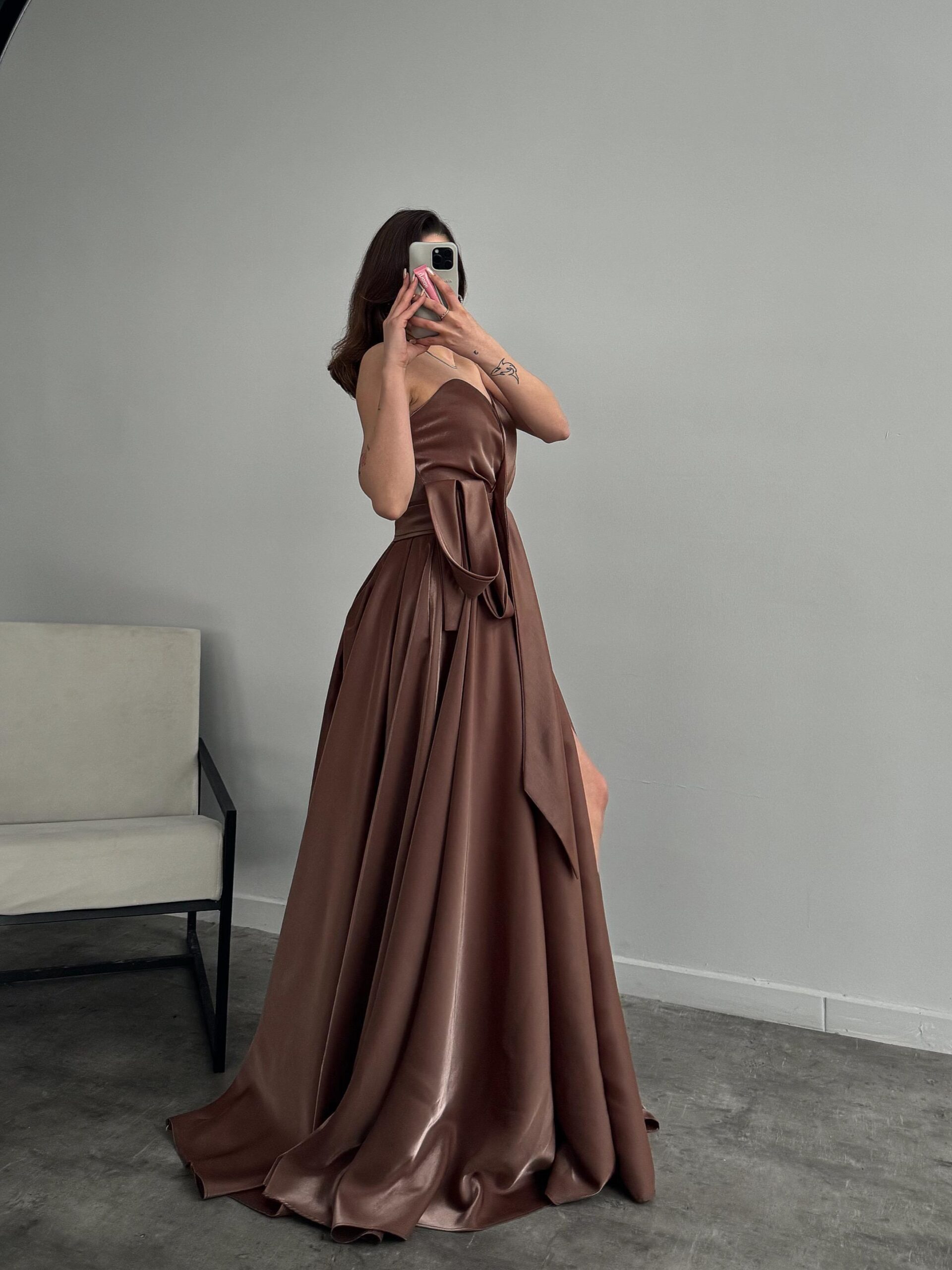 Melinda Straplez Saten Görünümlü Kahve Abiye