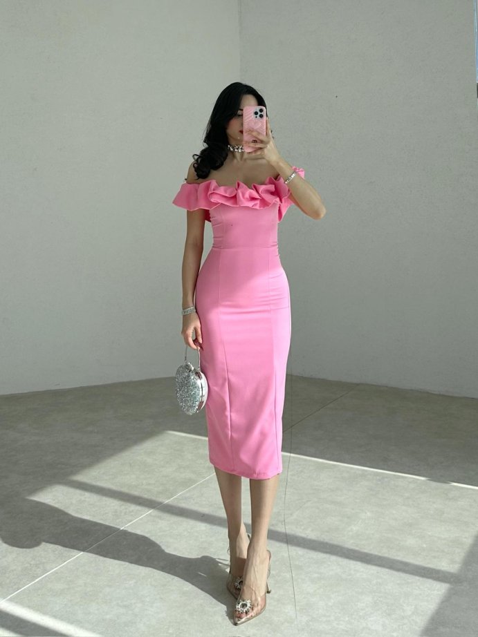 Fırfırlı Straplez Kalem Kesim Midi SOPHİA Elbise tam kalıplıdır.