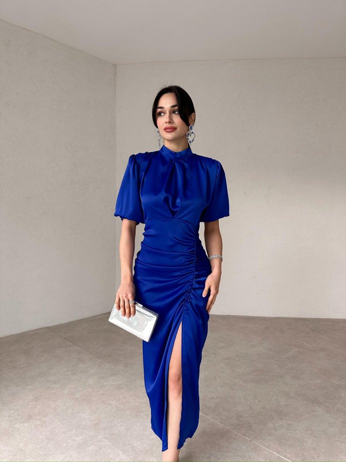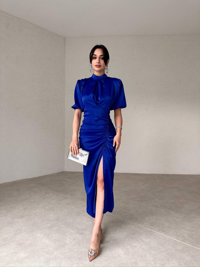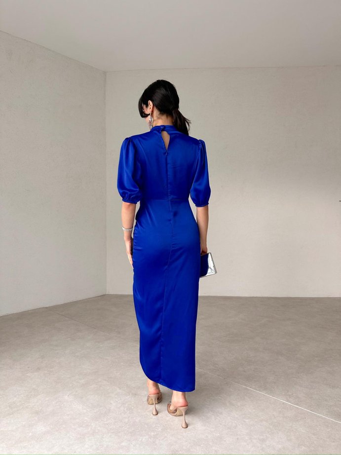Saks Mavisi Drapeli Saten Kumaş Midi VENLO Elbise