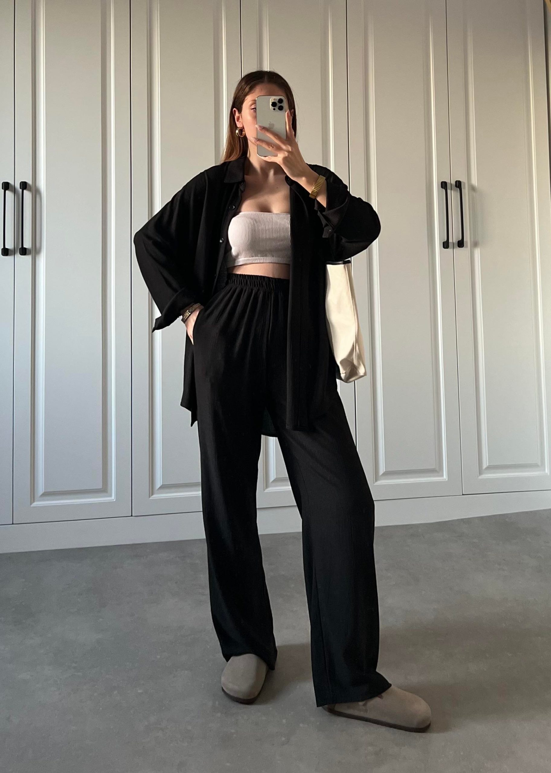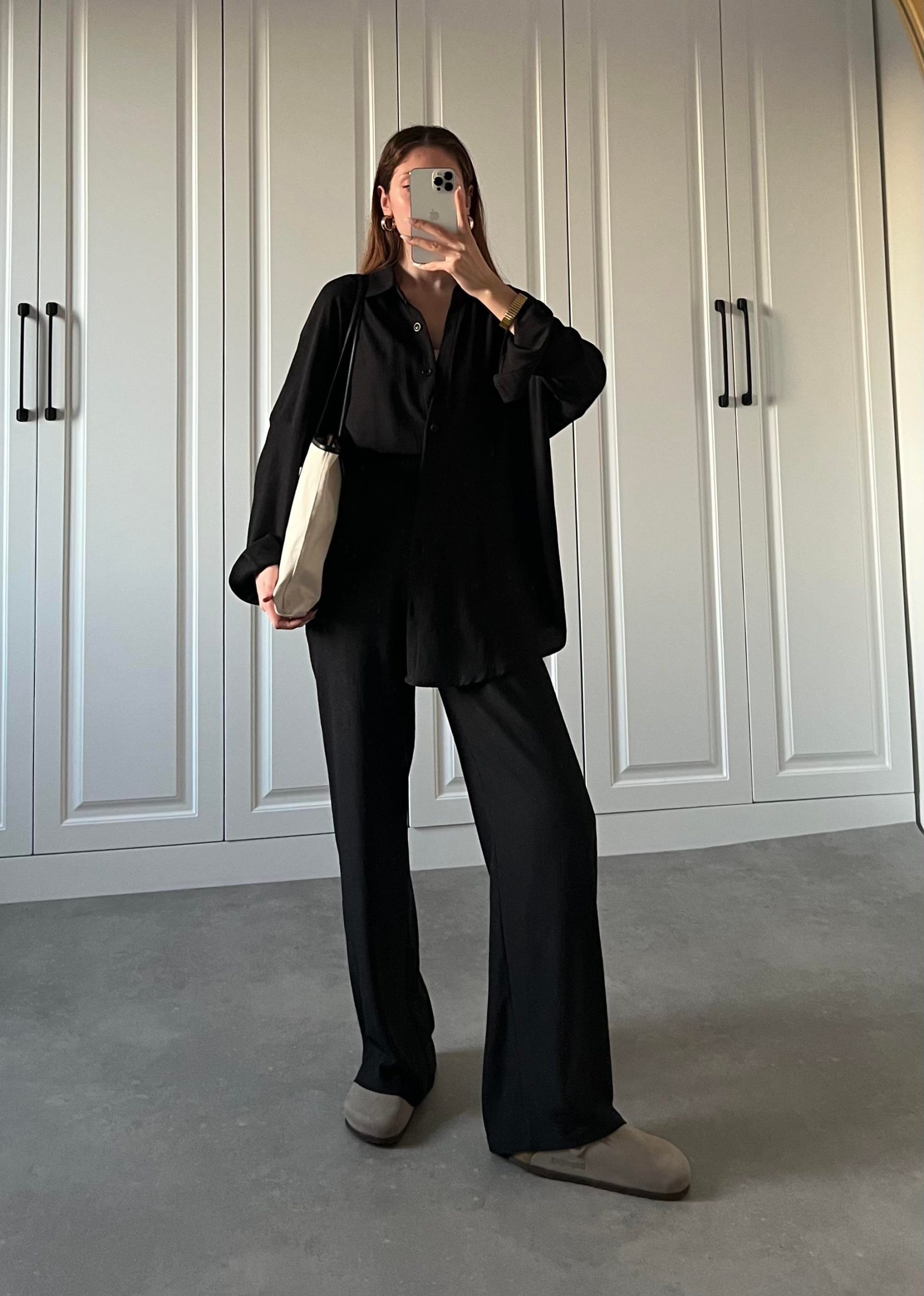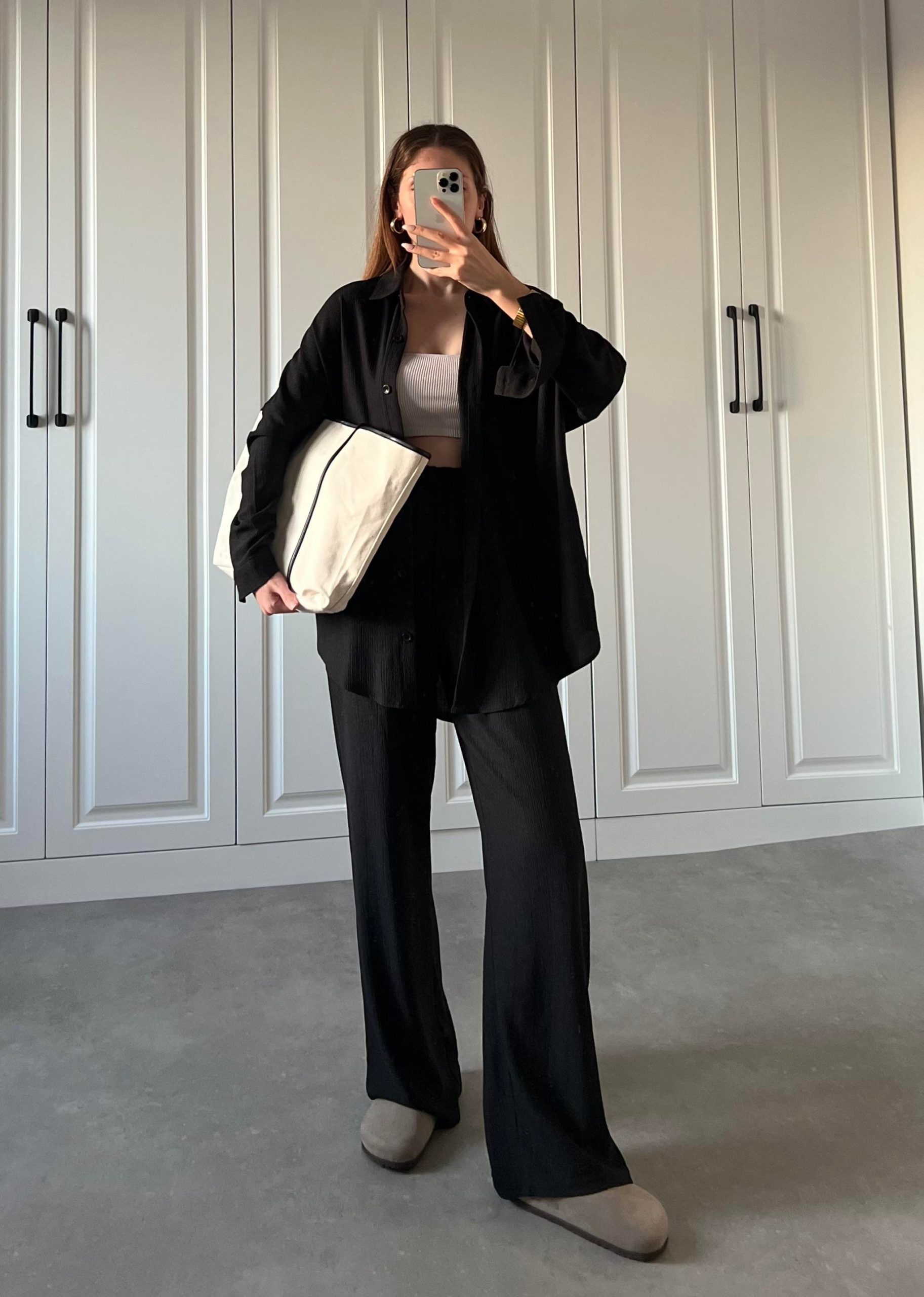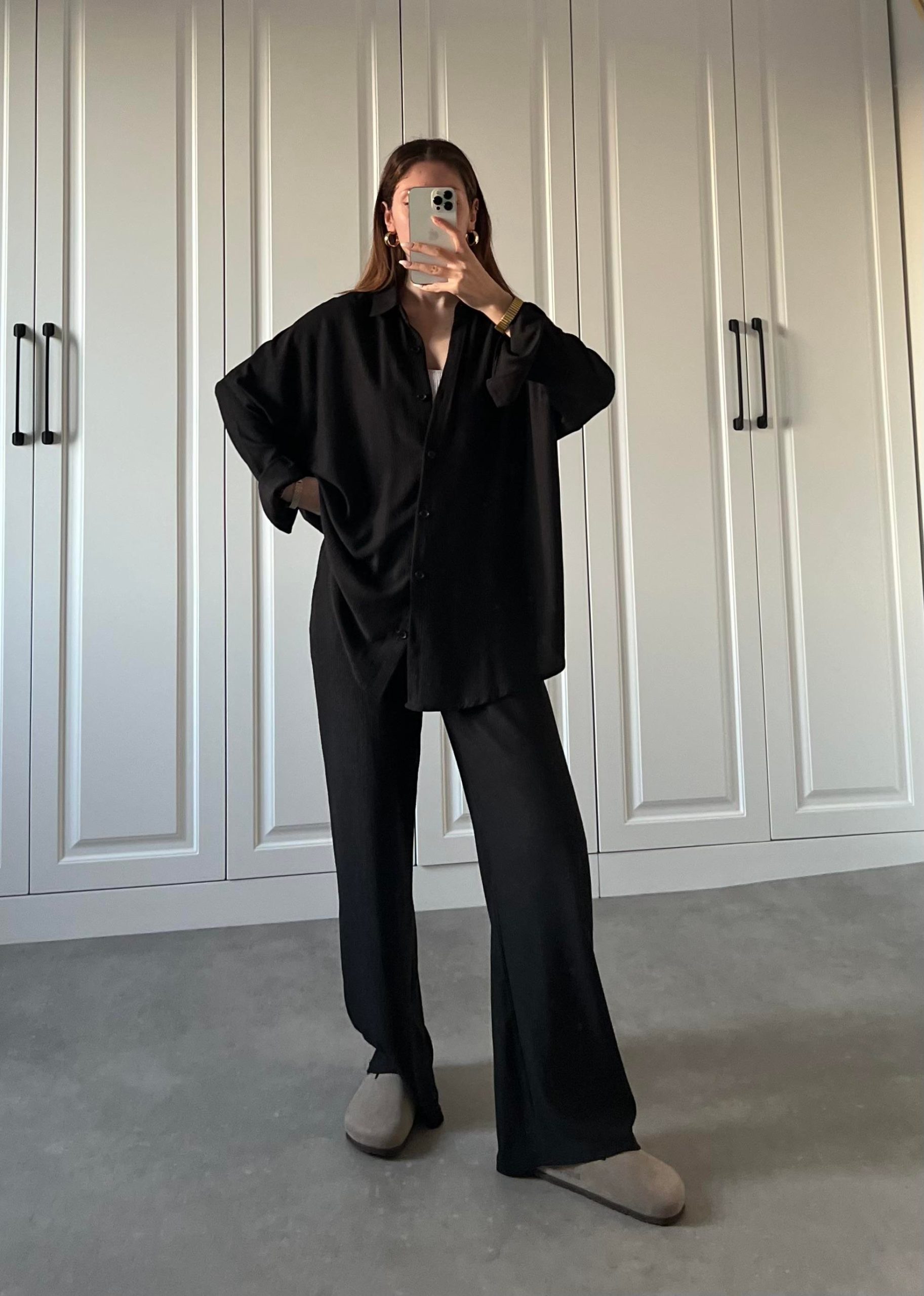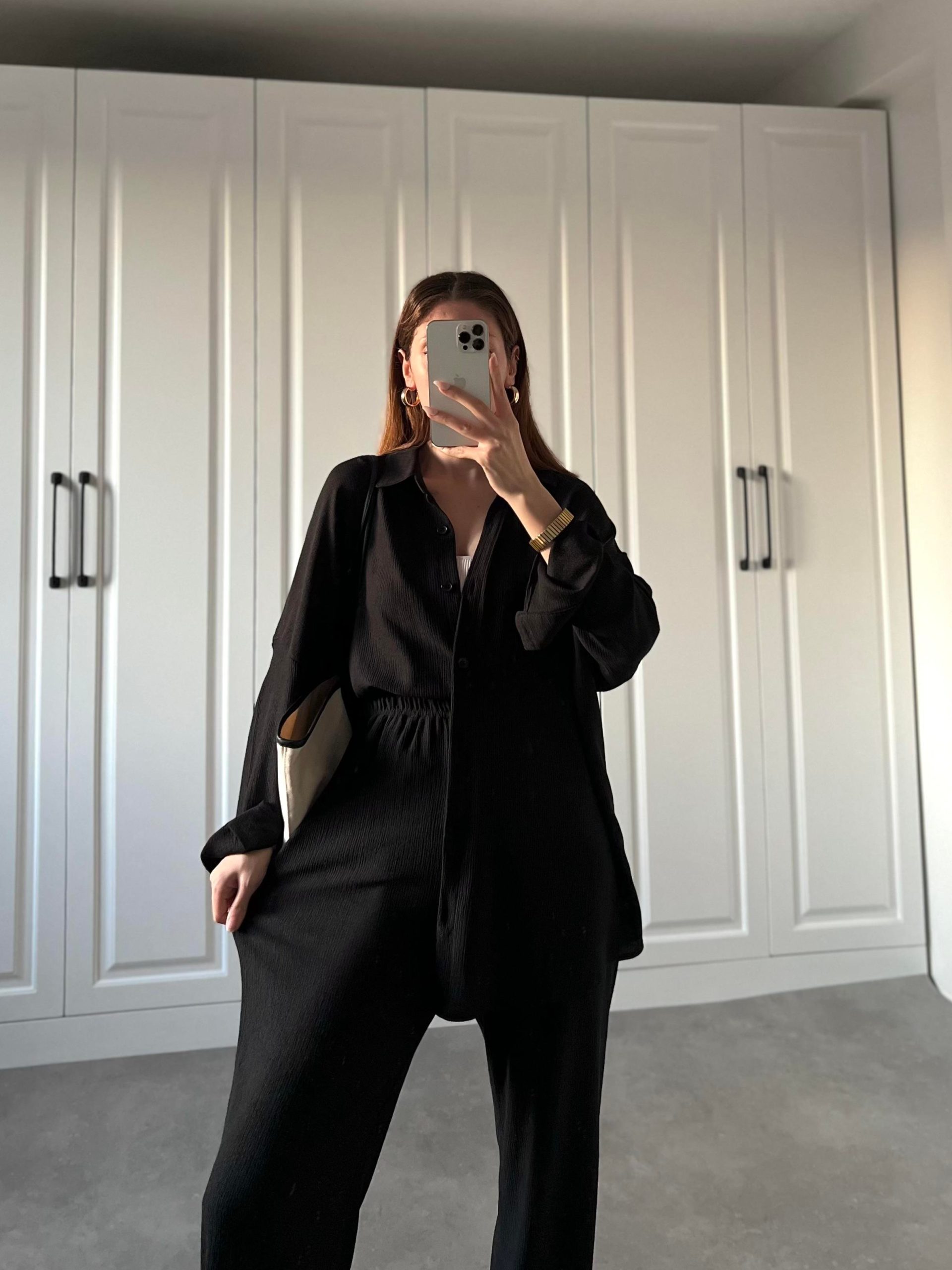 Ana Sayfa ÇOK SATANLAR Siyah Krinkıl Basic Gömlek Takım