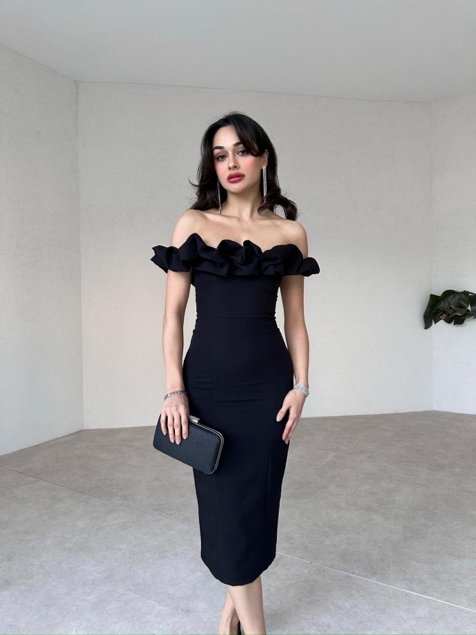 Fırfırlı Straplez Kalem Kesim Midi SOPHİA Elbise tam kalıplıdır.