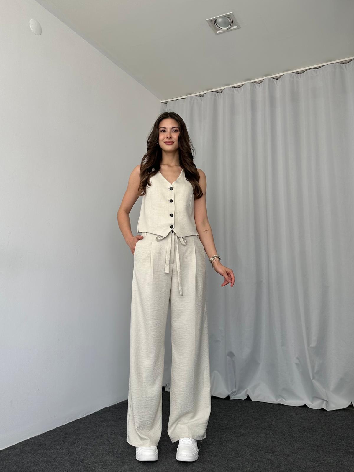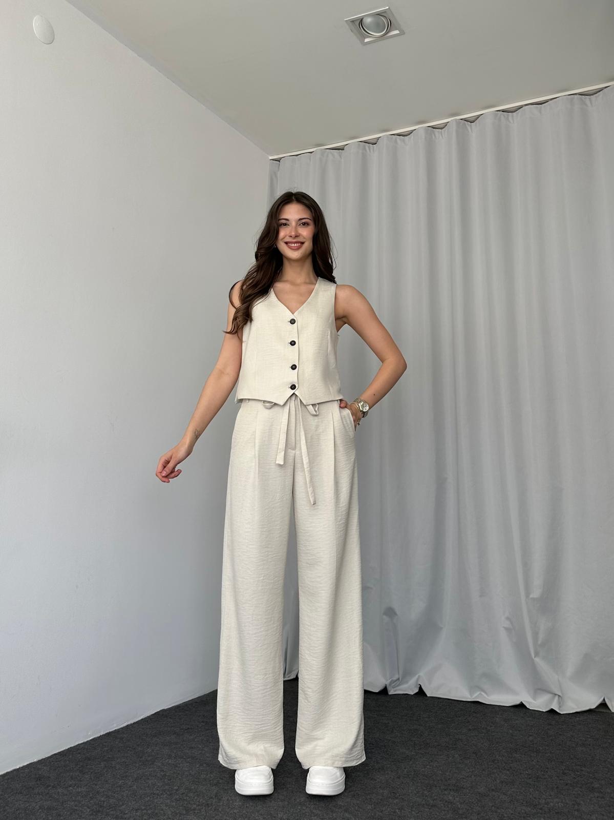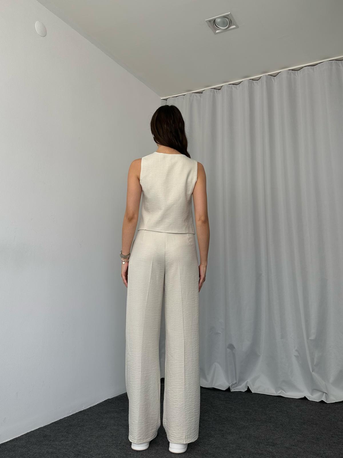 Beyaz Double Paça Pantolon-Yelek takım