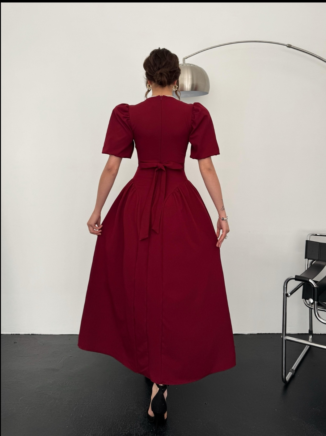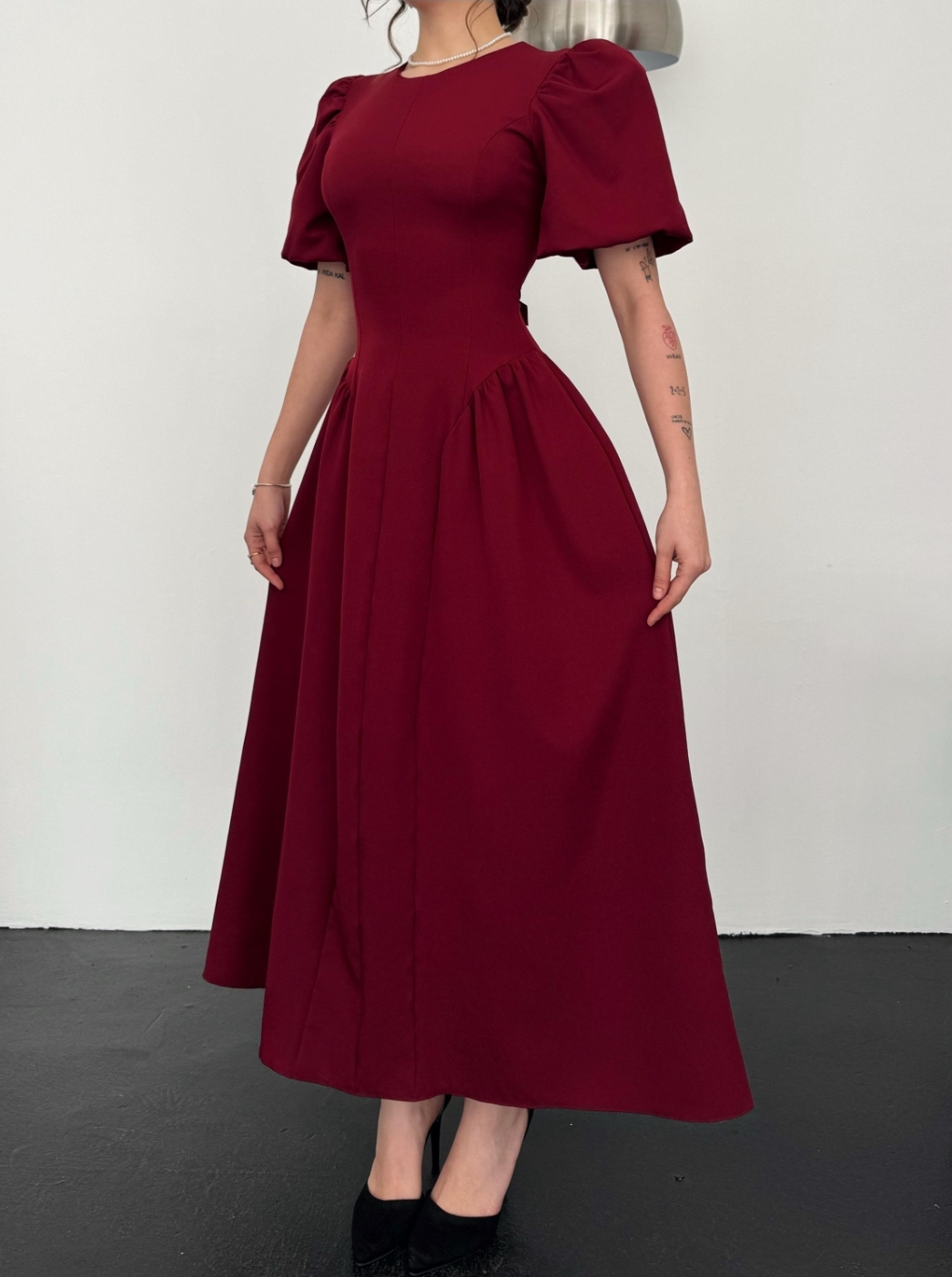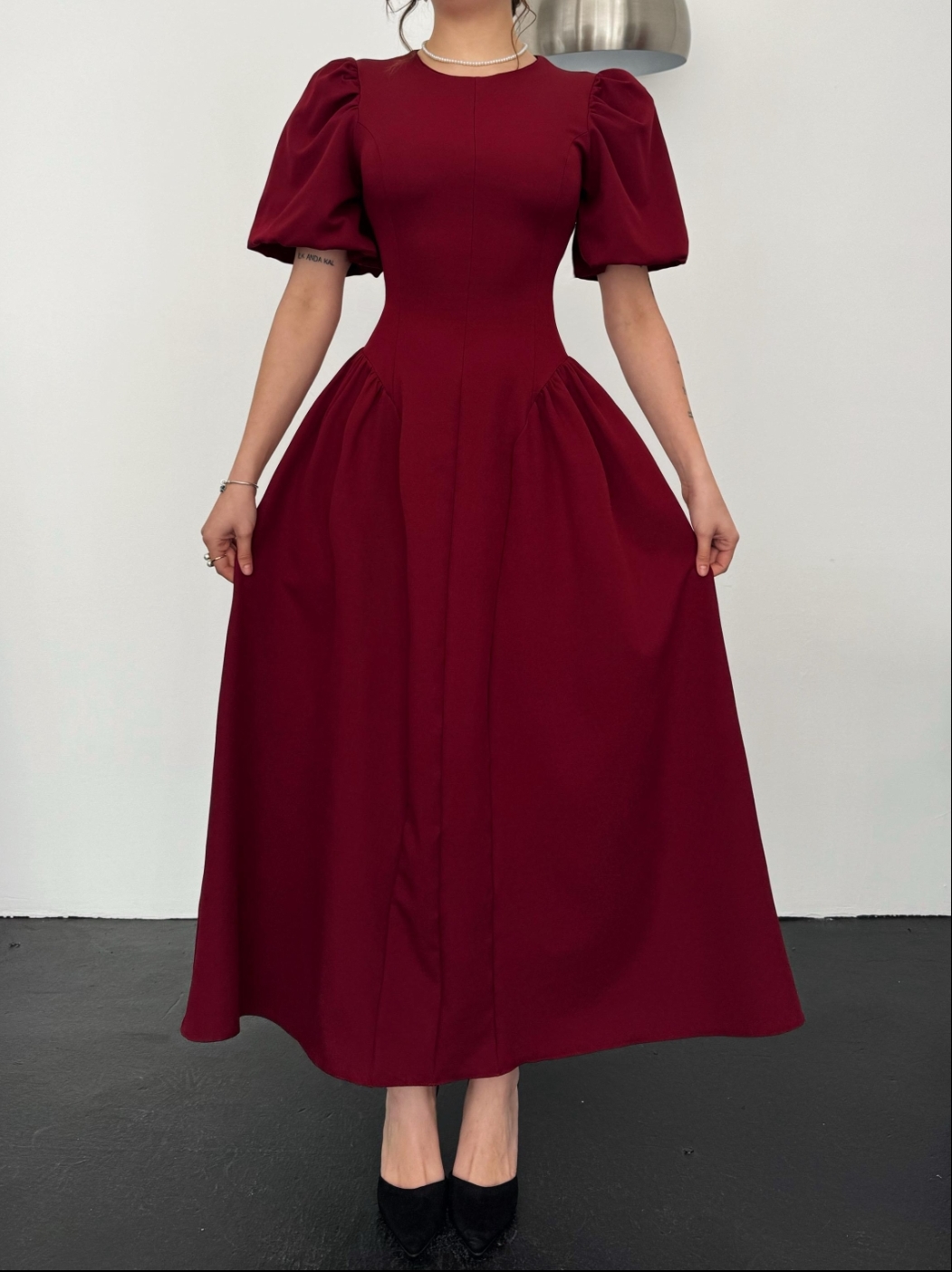 Twila Balon Kol Bağlamalı Bordo Uzun Elbise