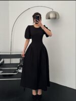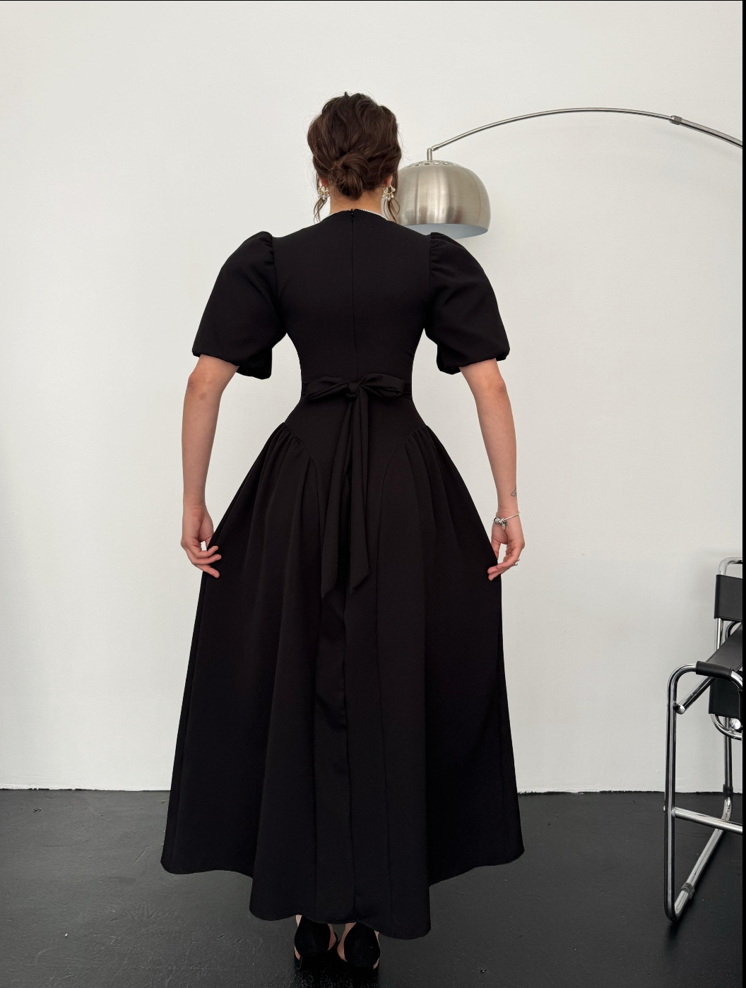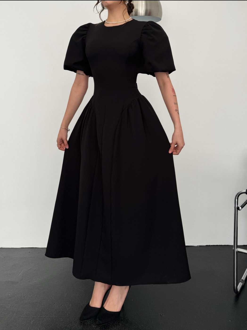 Twila Balon Kol Bağlamalı Siyah Uzun Elbise