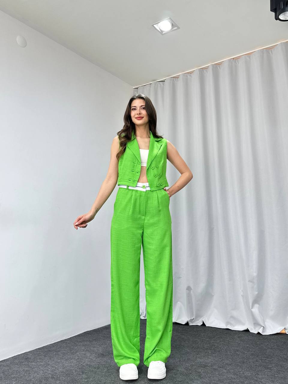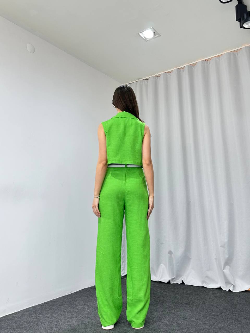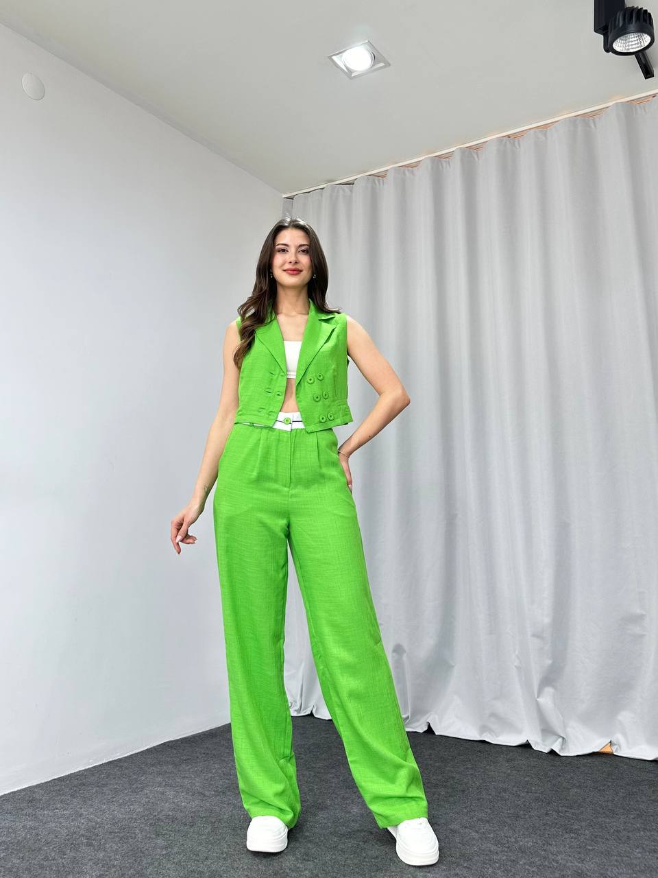 Yeşil Bel Detaylı Plazzo-Yelek Takım
