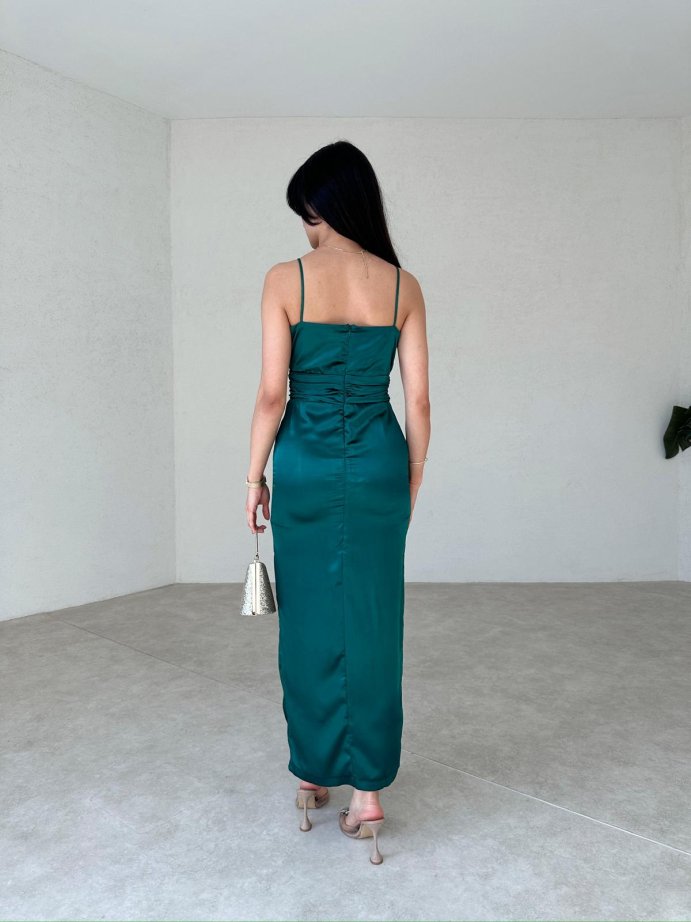 Yeşil İnce Askılı Göğüsü Drapeli Vencover Saten Elbise