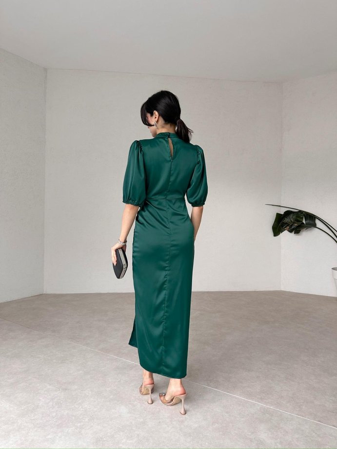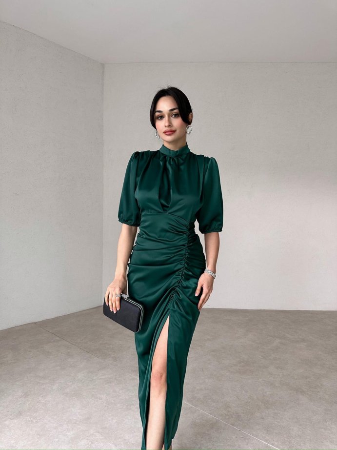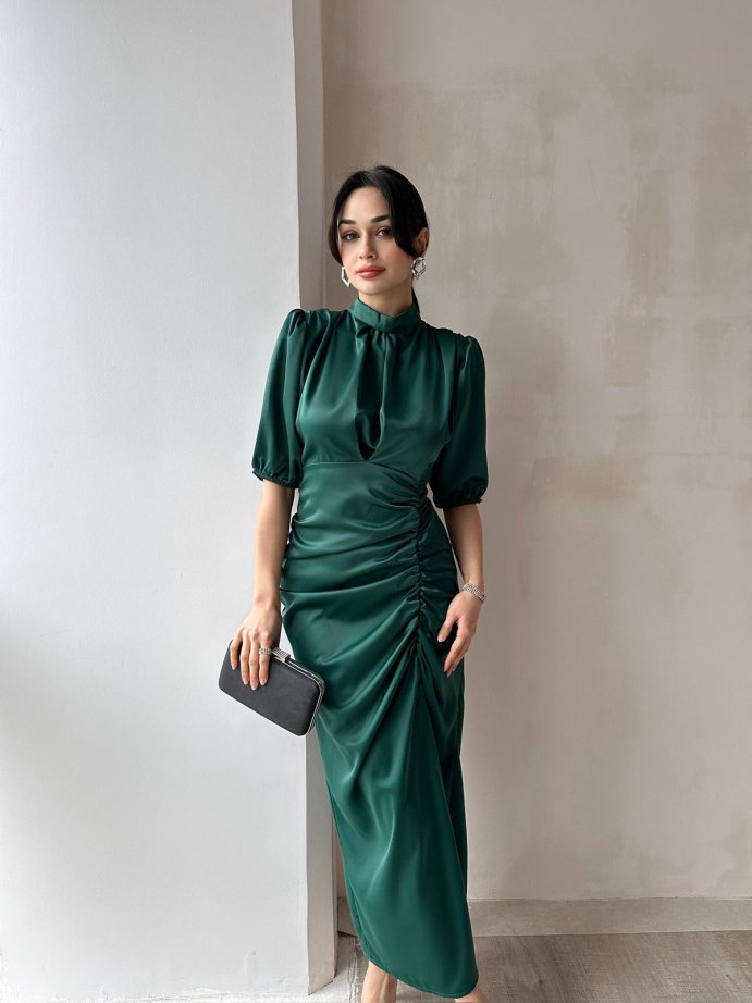 Zümrüt Yeşili Drapeli Saten Kumaş Midi VENLO Elbise
